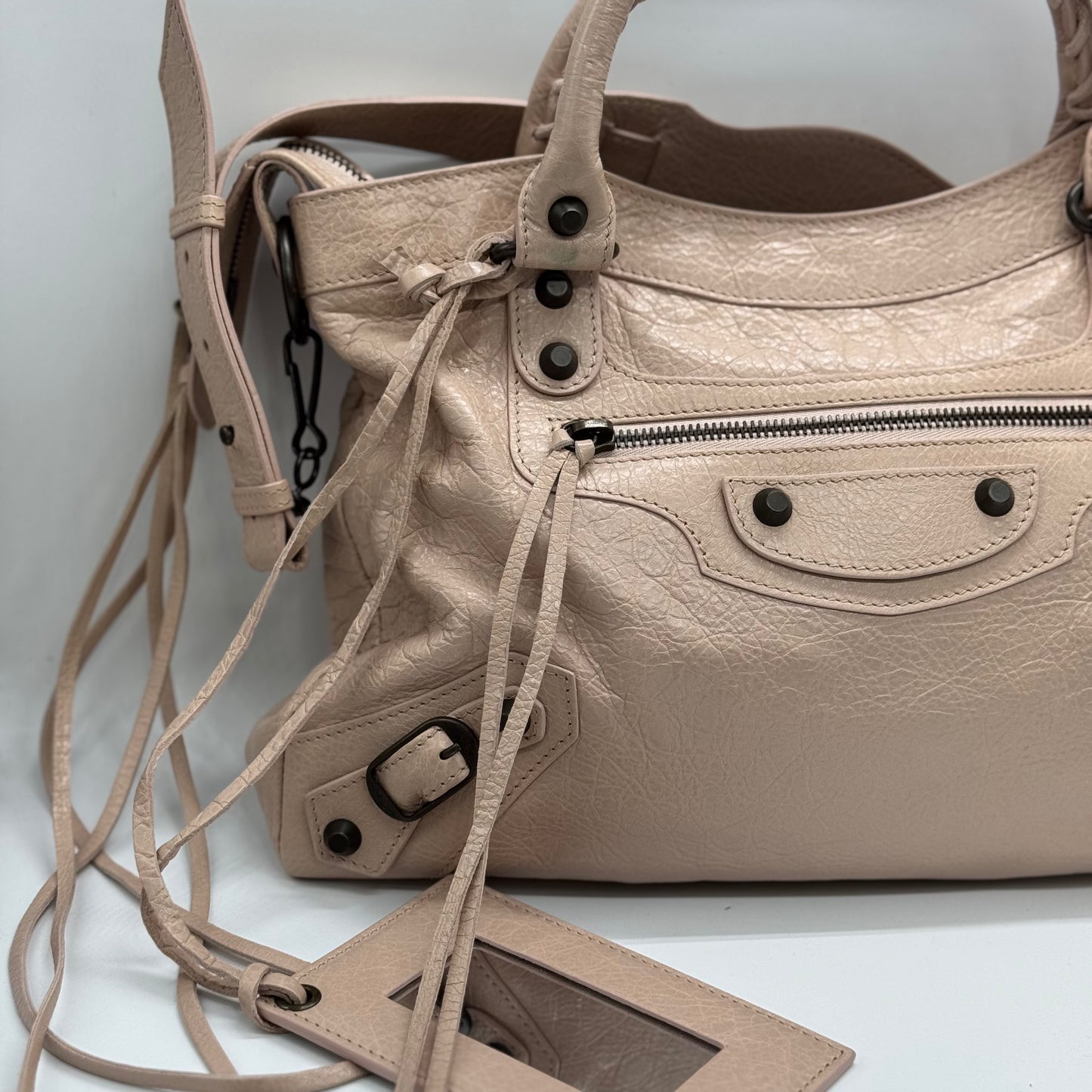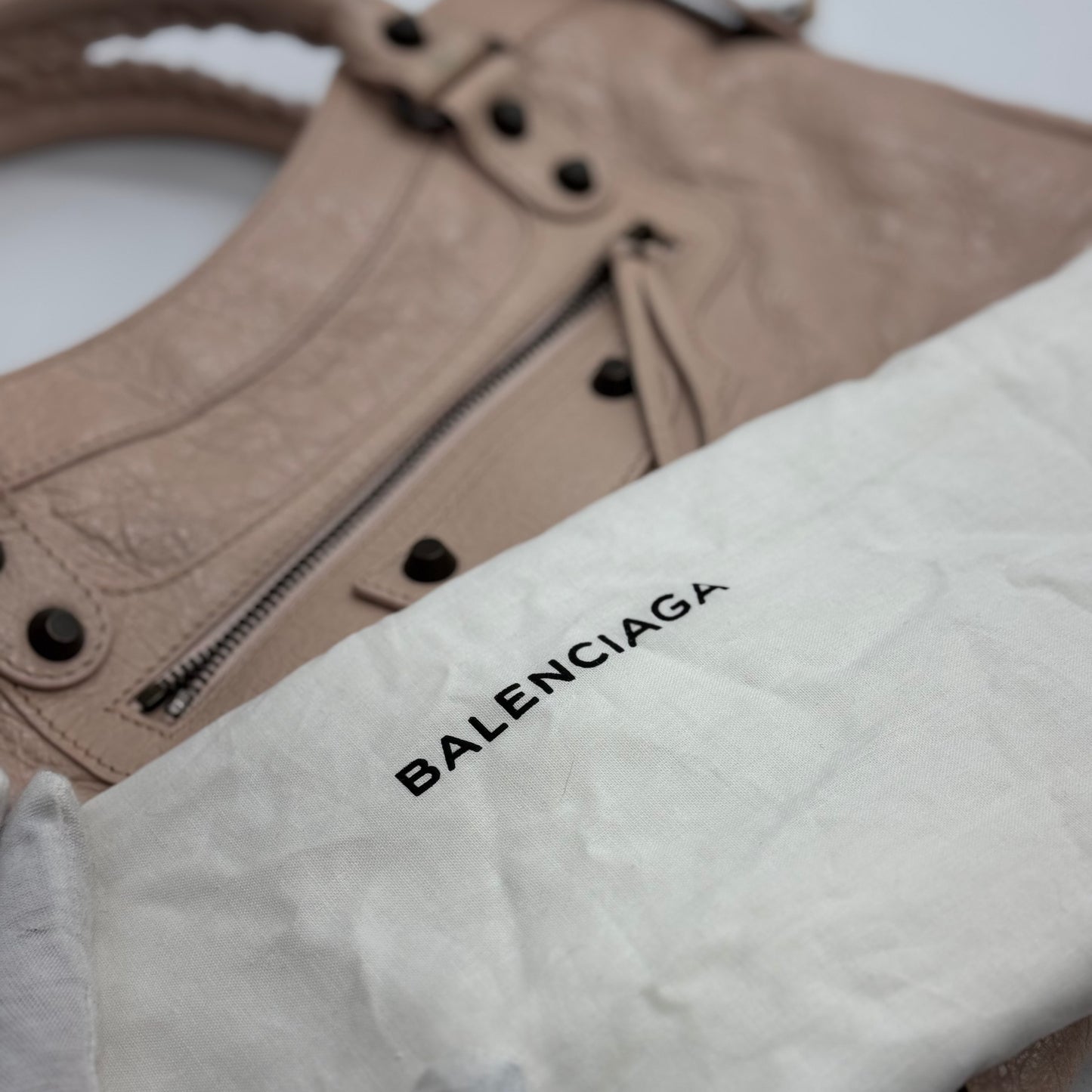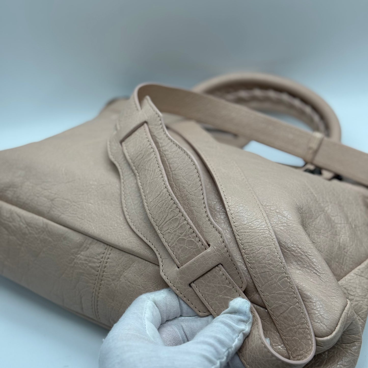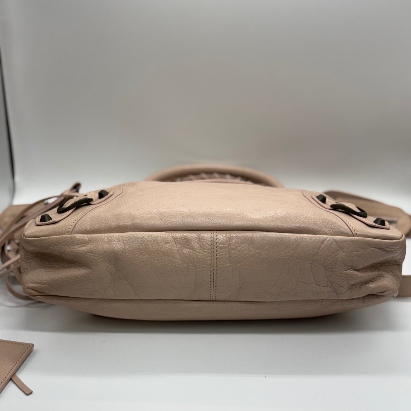 Sac First Balenciaga en cuir d'agneau Arena et bijouterie en argent vieillit. Ce modèle se porte à la main ou à l'épaule.