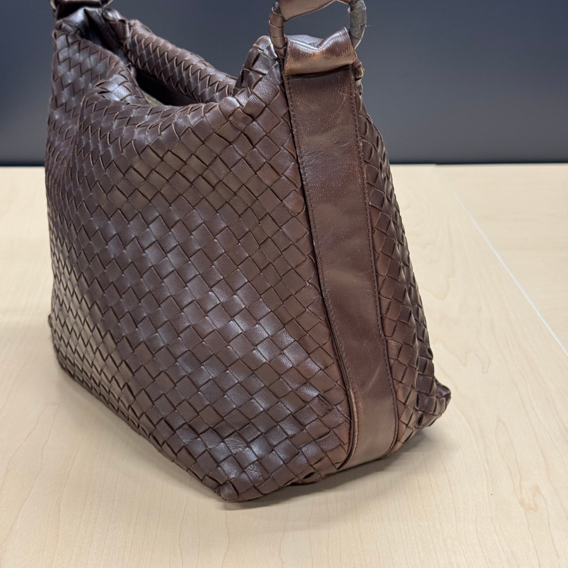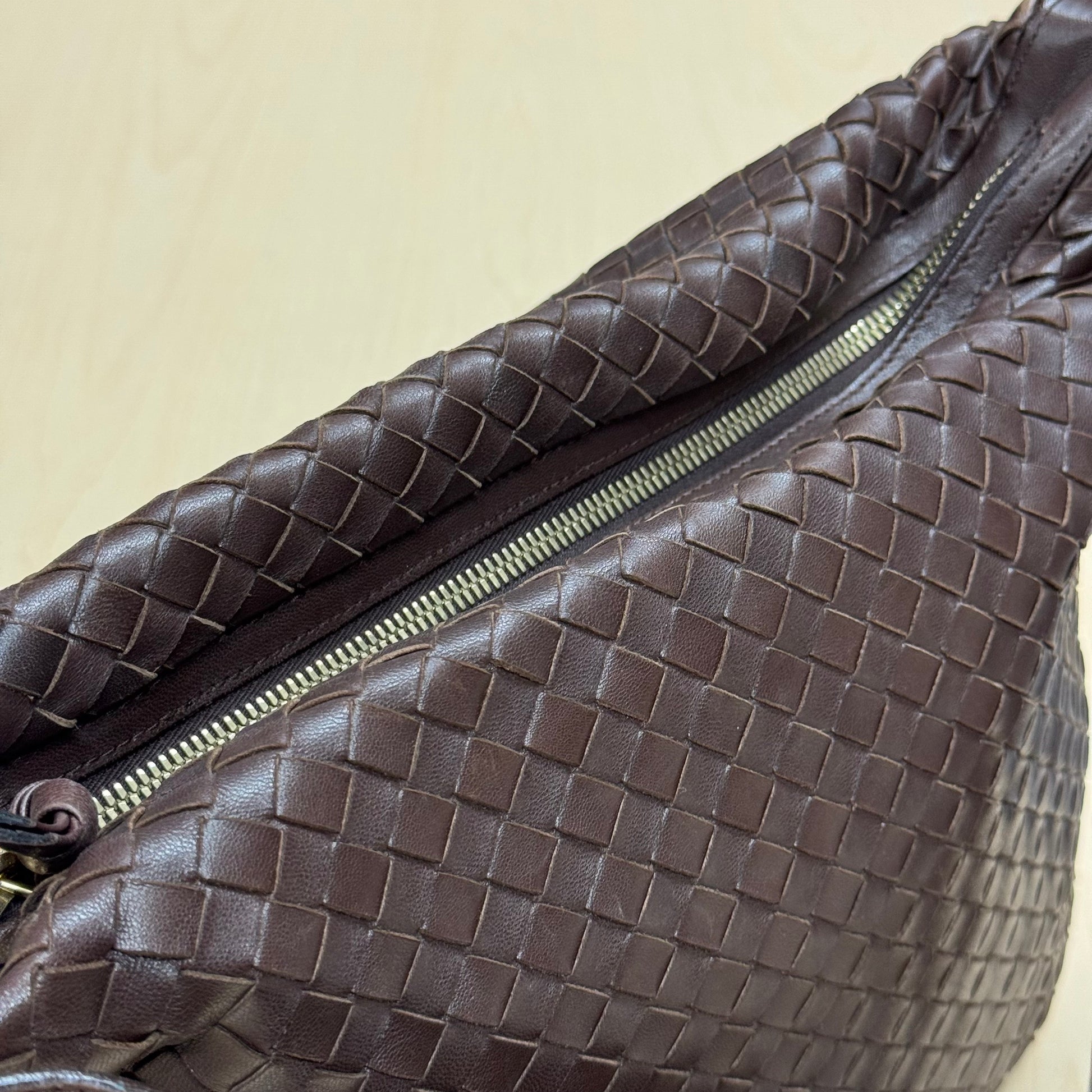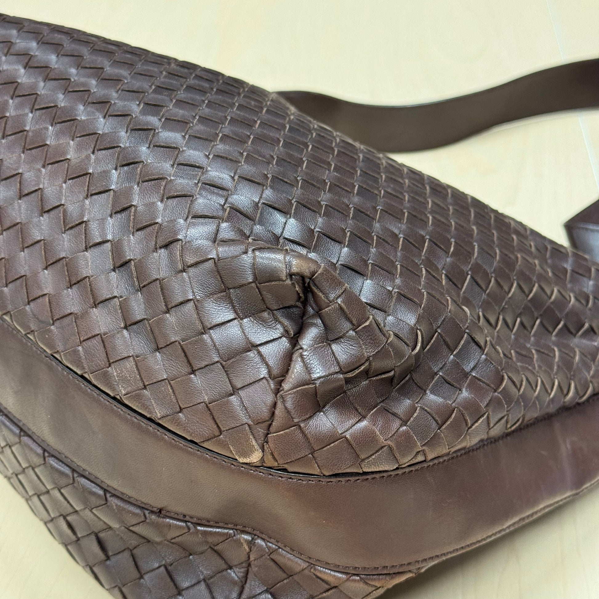 Sac bourse porté bandoulière en cuir intrecciato chocolat