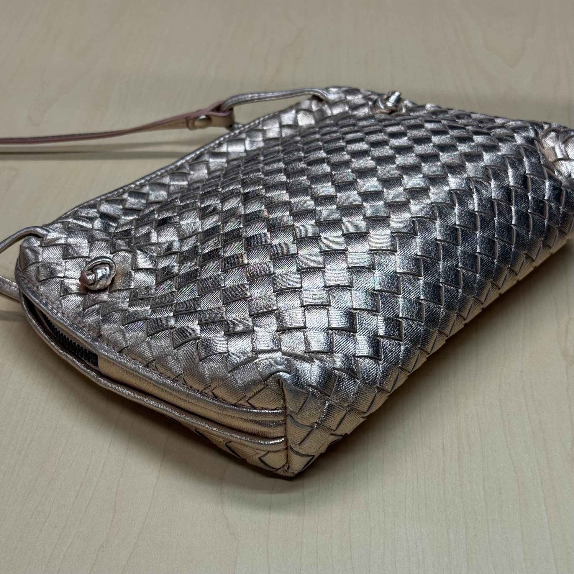 Besace Bottega Veneta en cuir de veau intrecciato rose gold.
