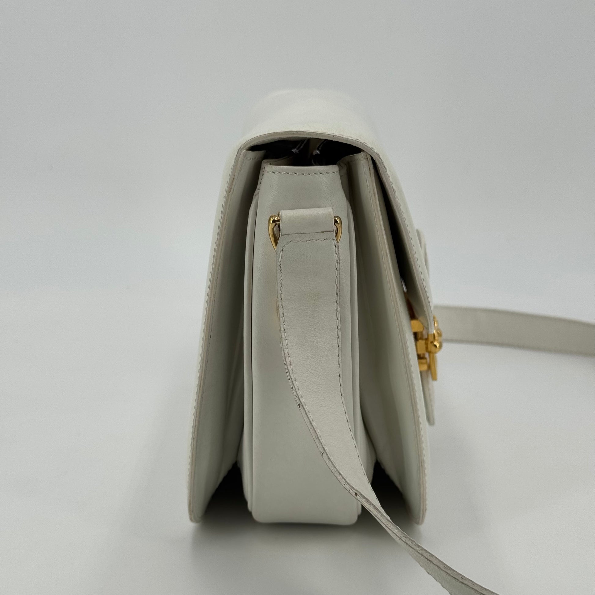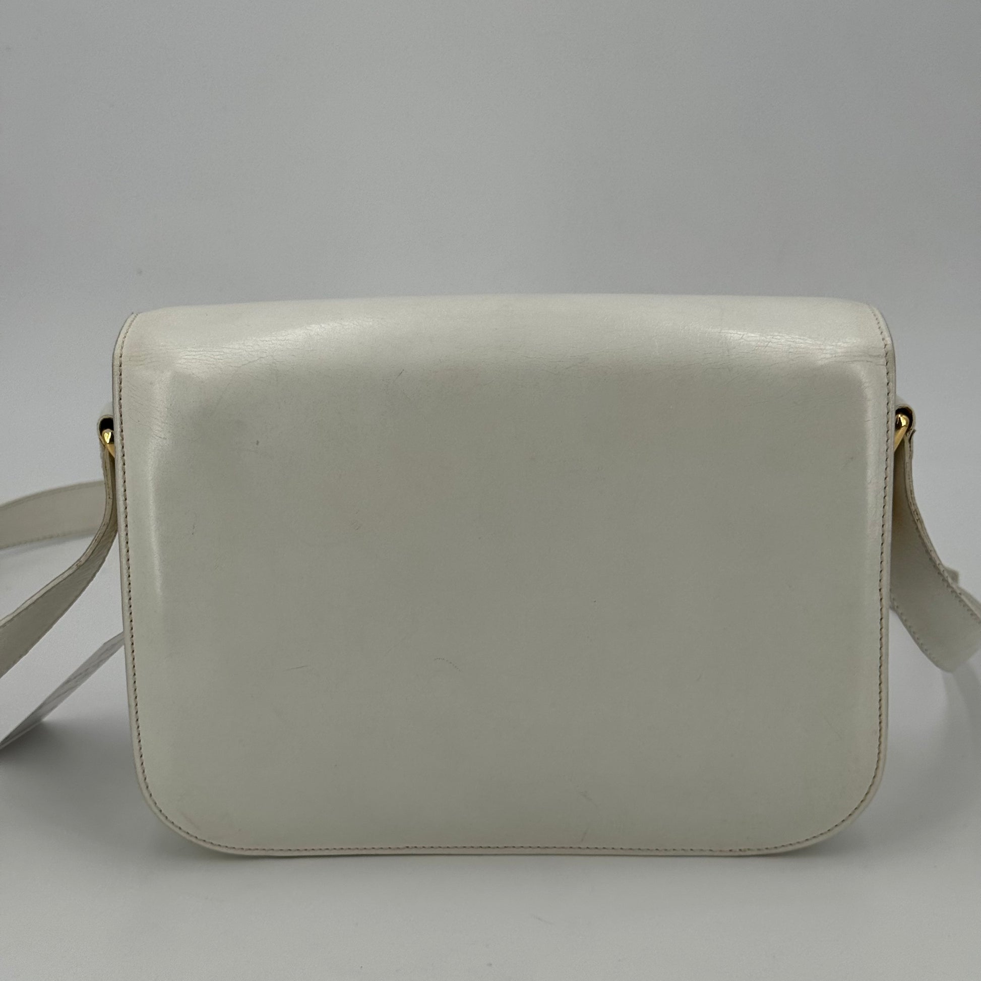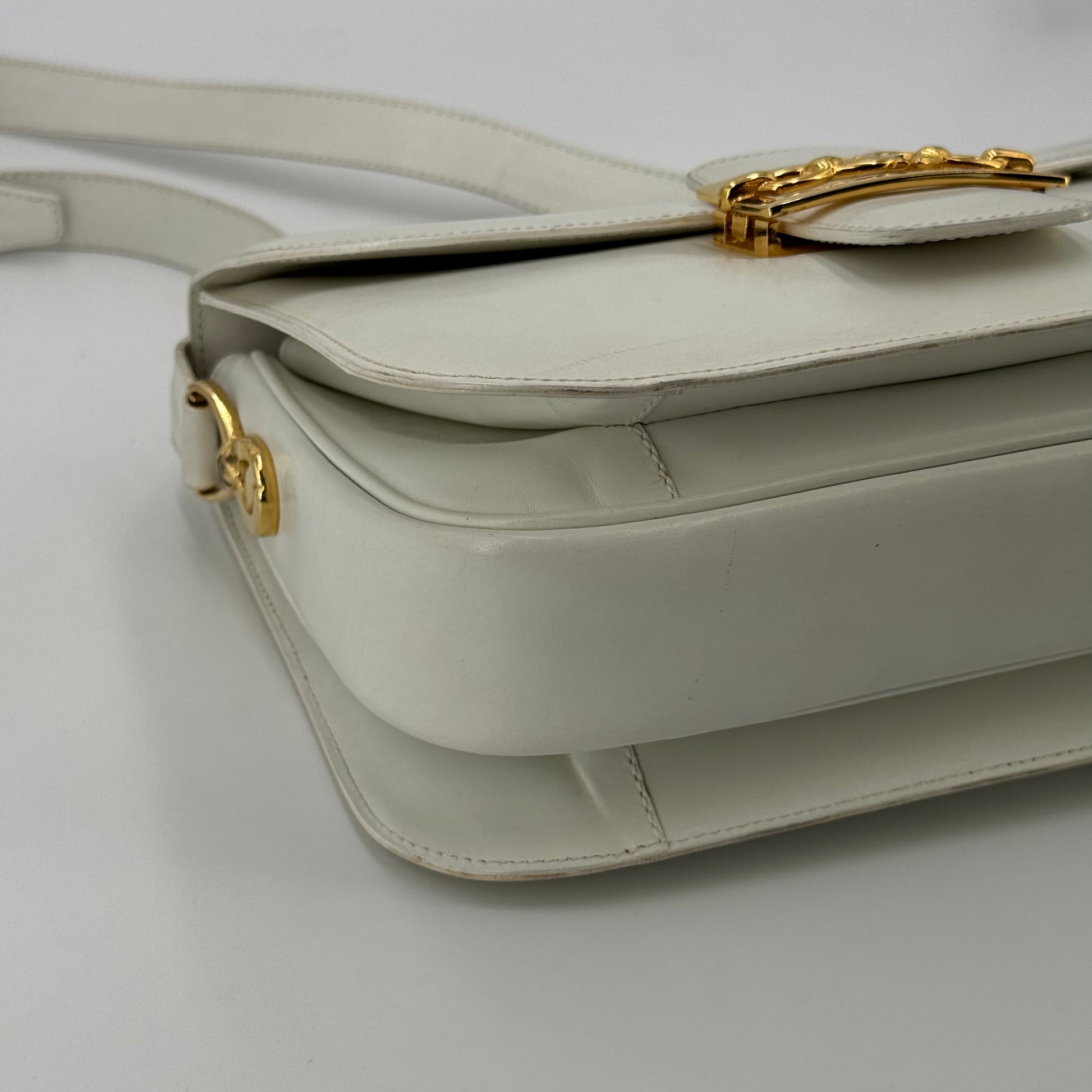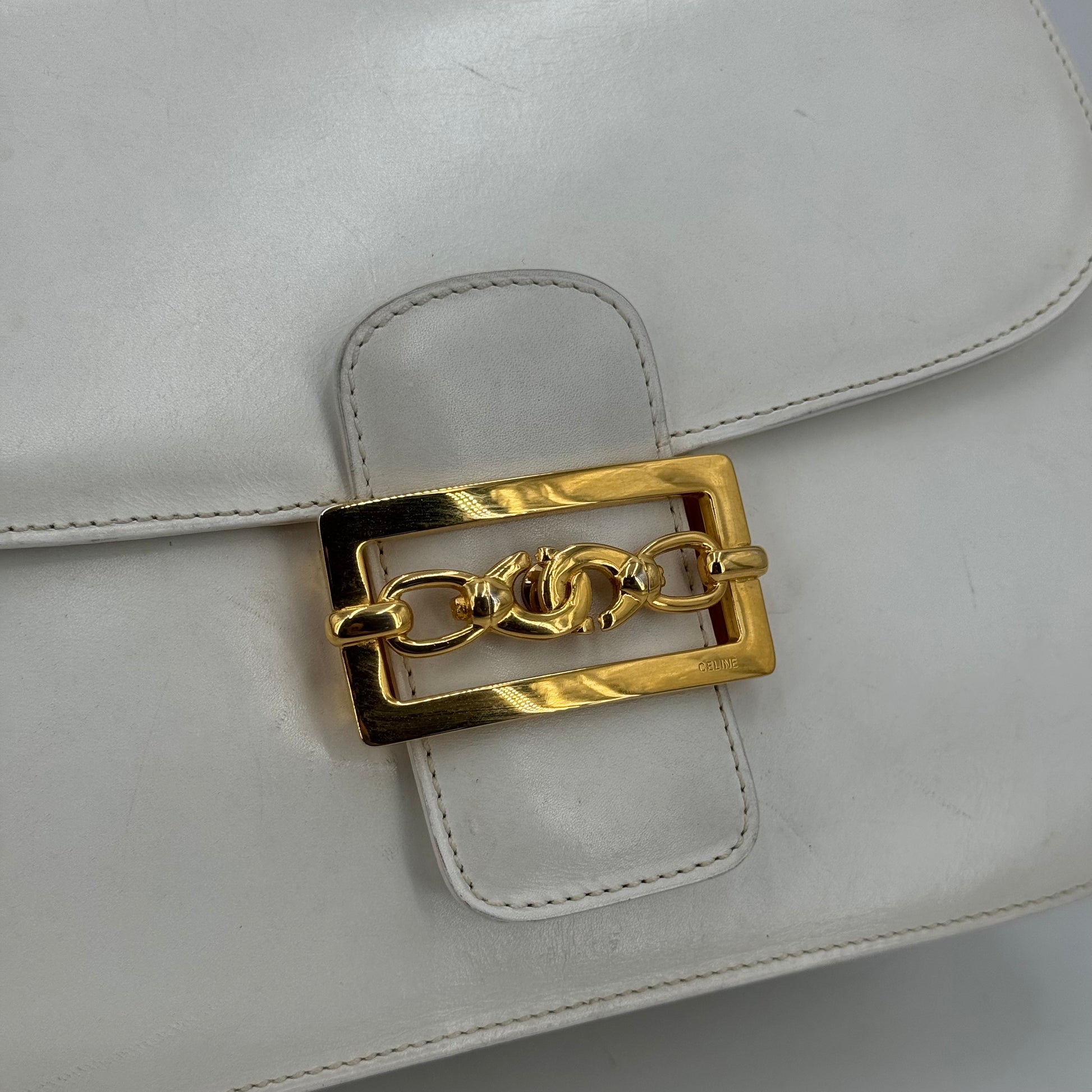 Besace Céline vintage en cuir de veau box blanc et bijouterie dorée