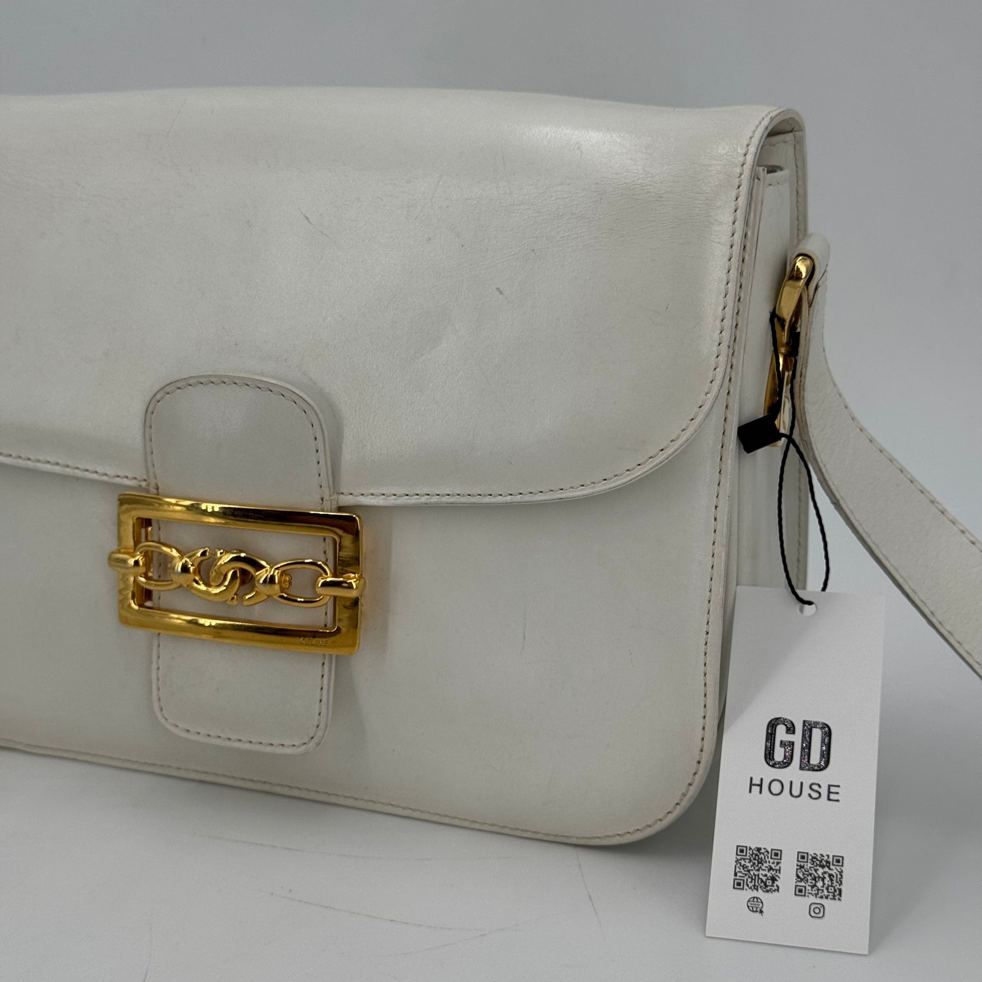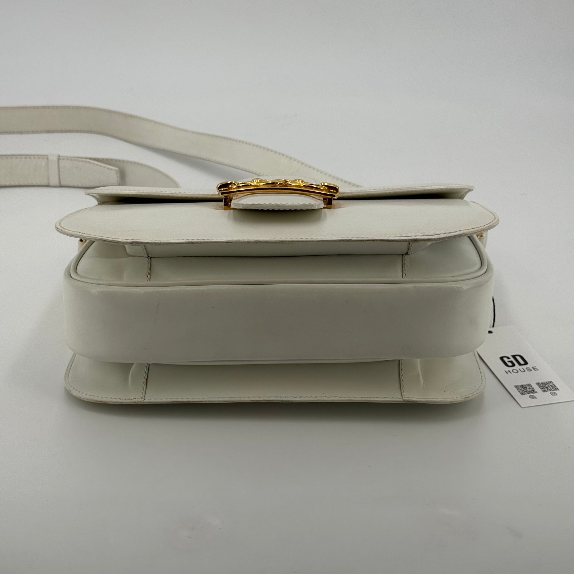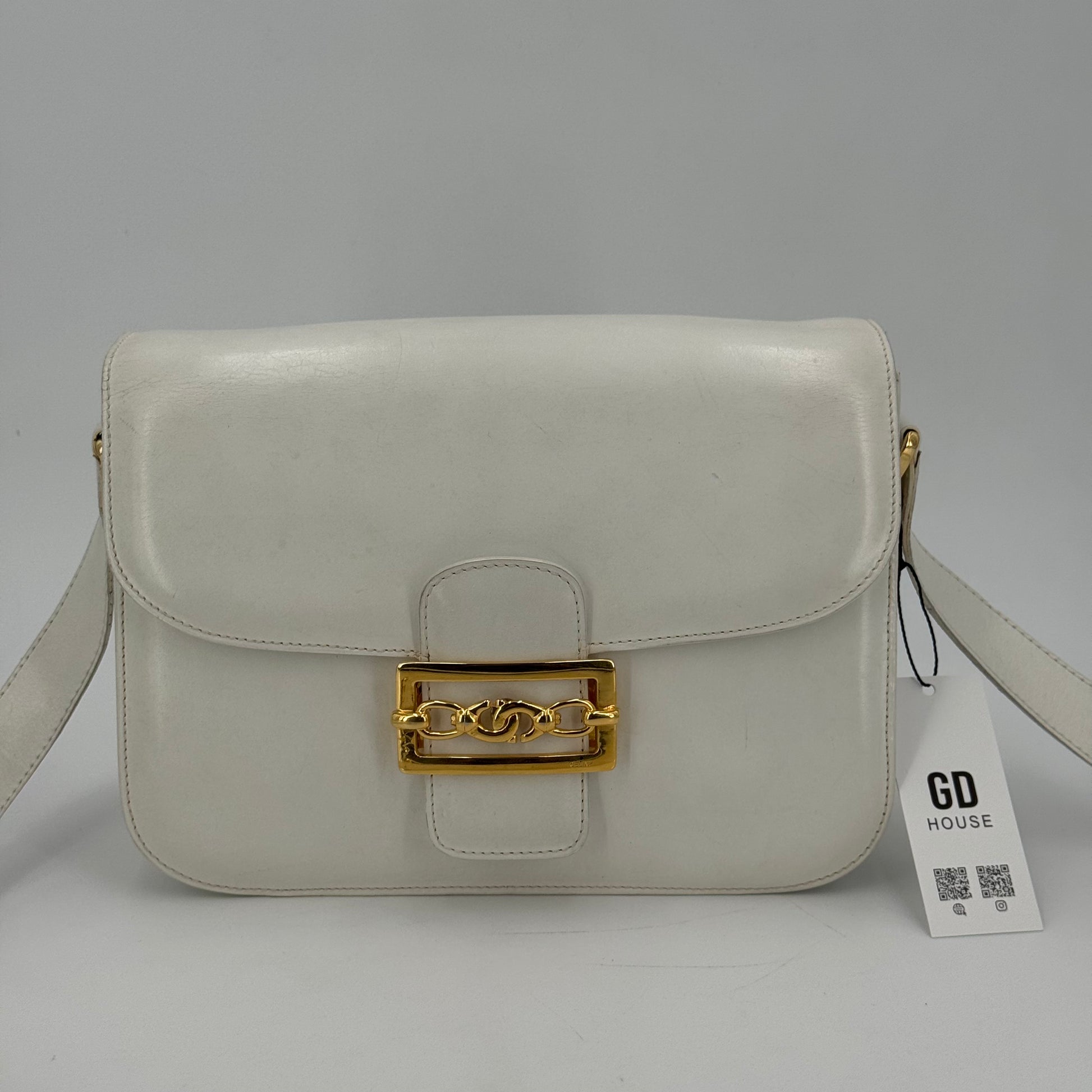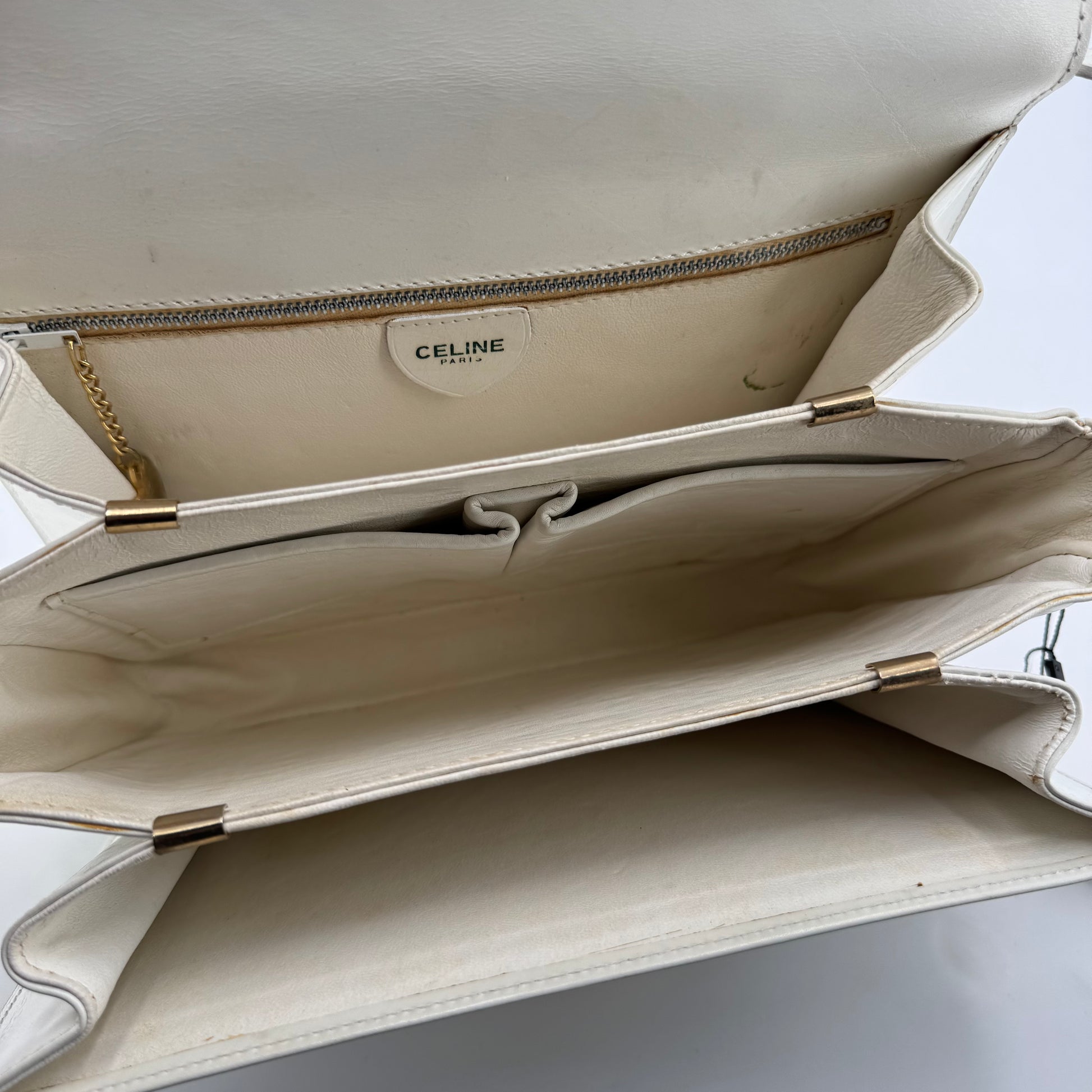 Besace Céline vintage en cuir de veau box blanc et bijouterie dorée