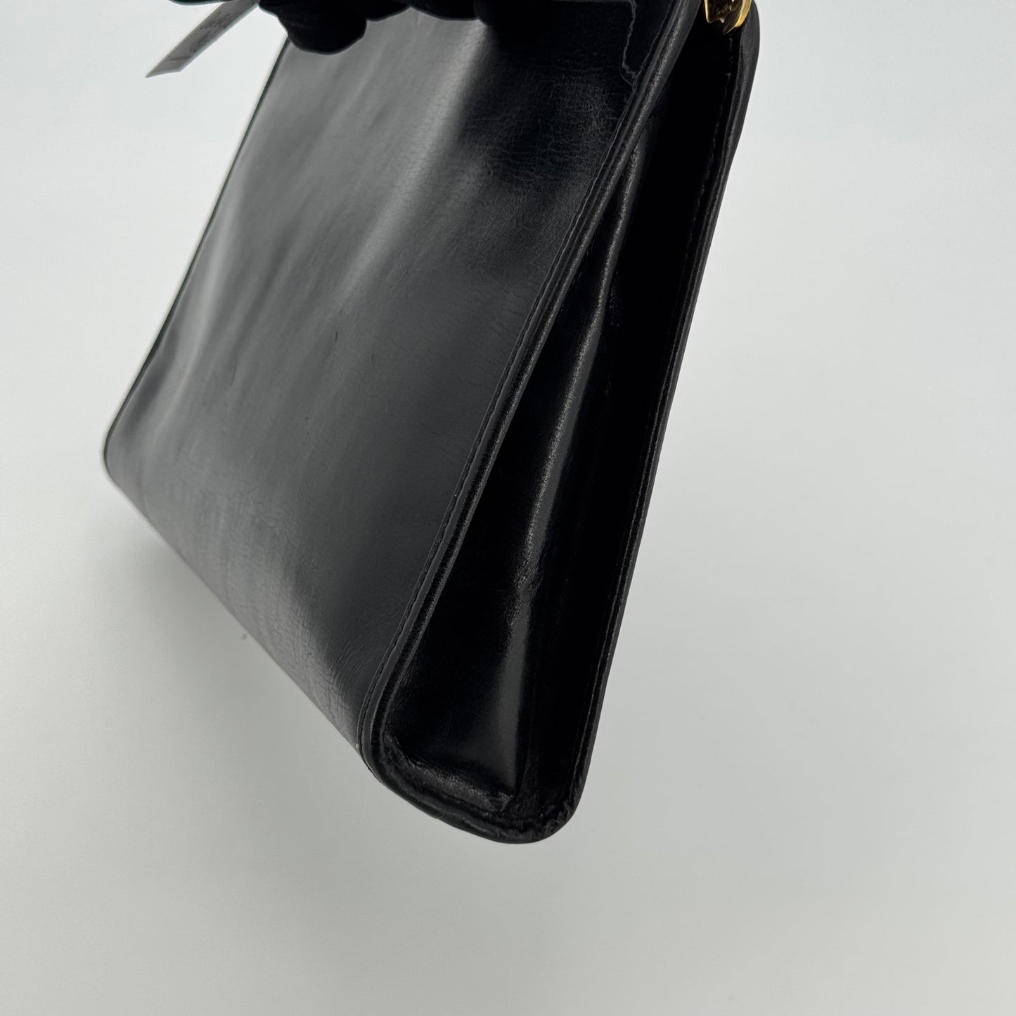 Pochette en cuir de veau noir , médaillon logo triomphe , bijouterie dorée