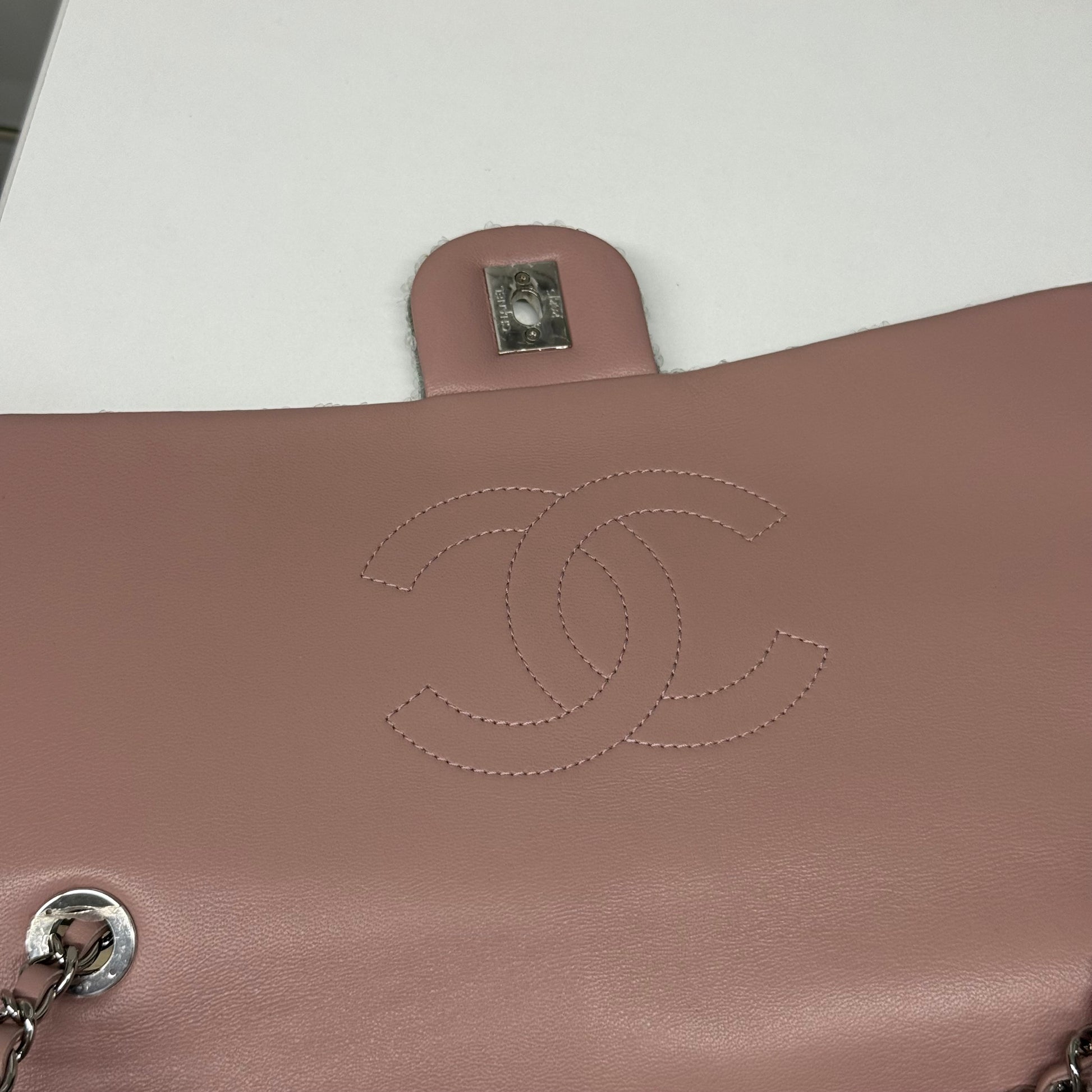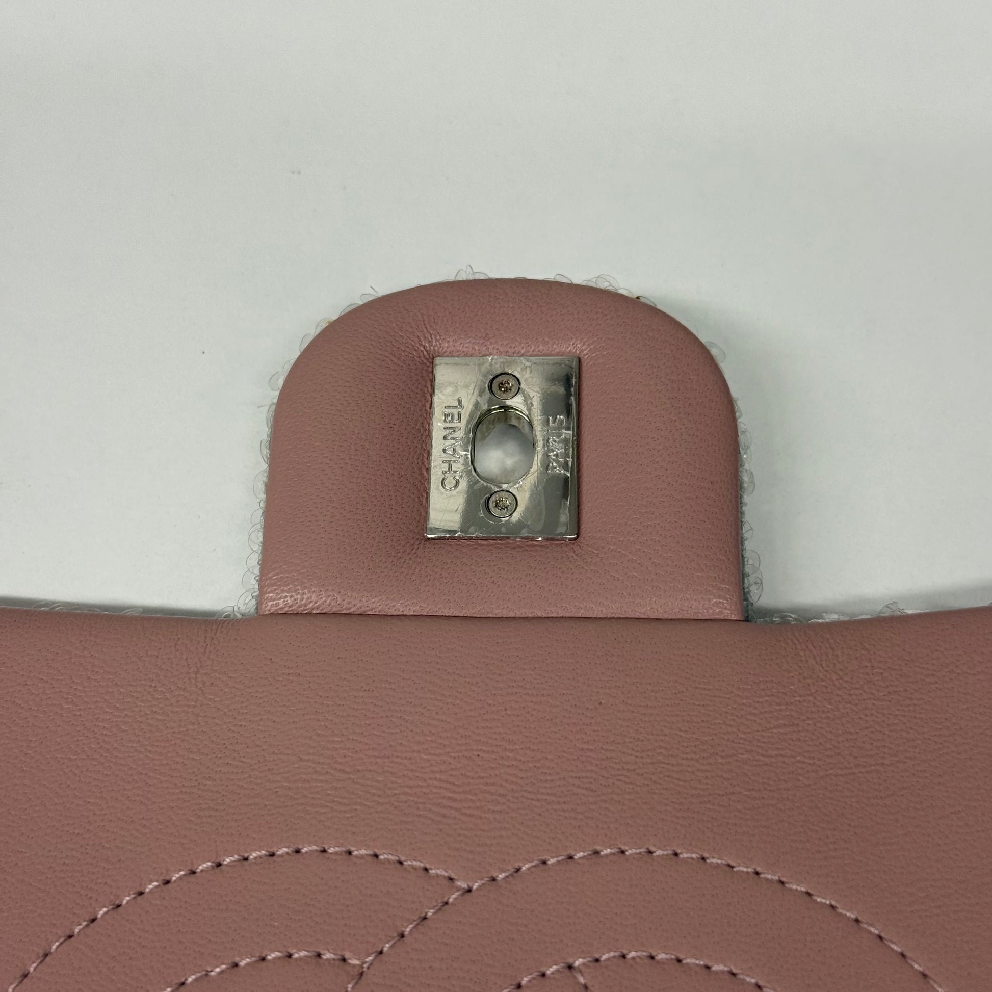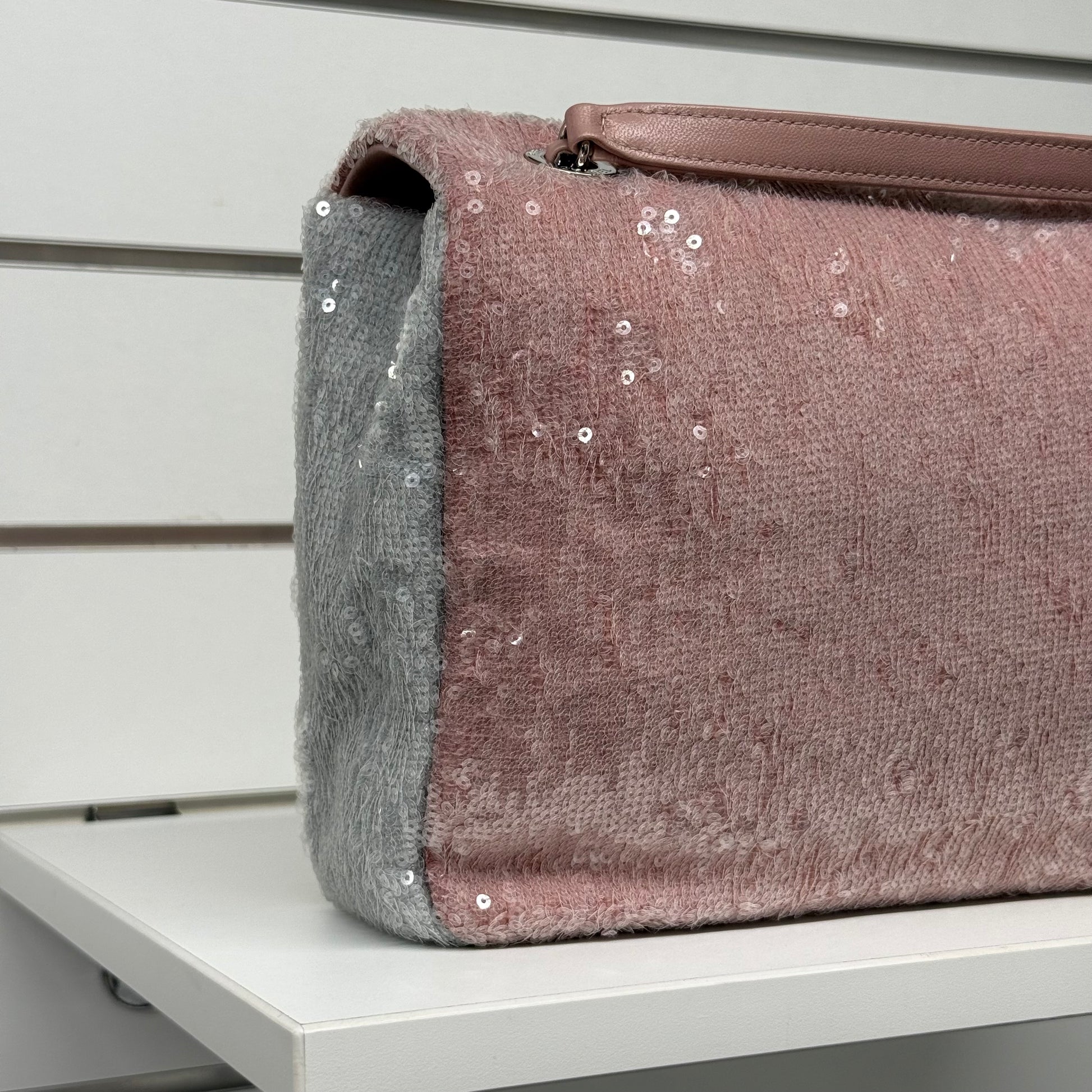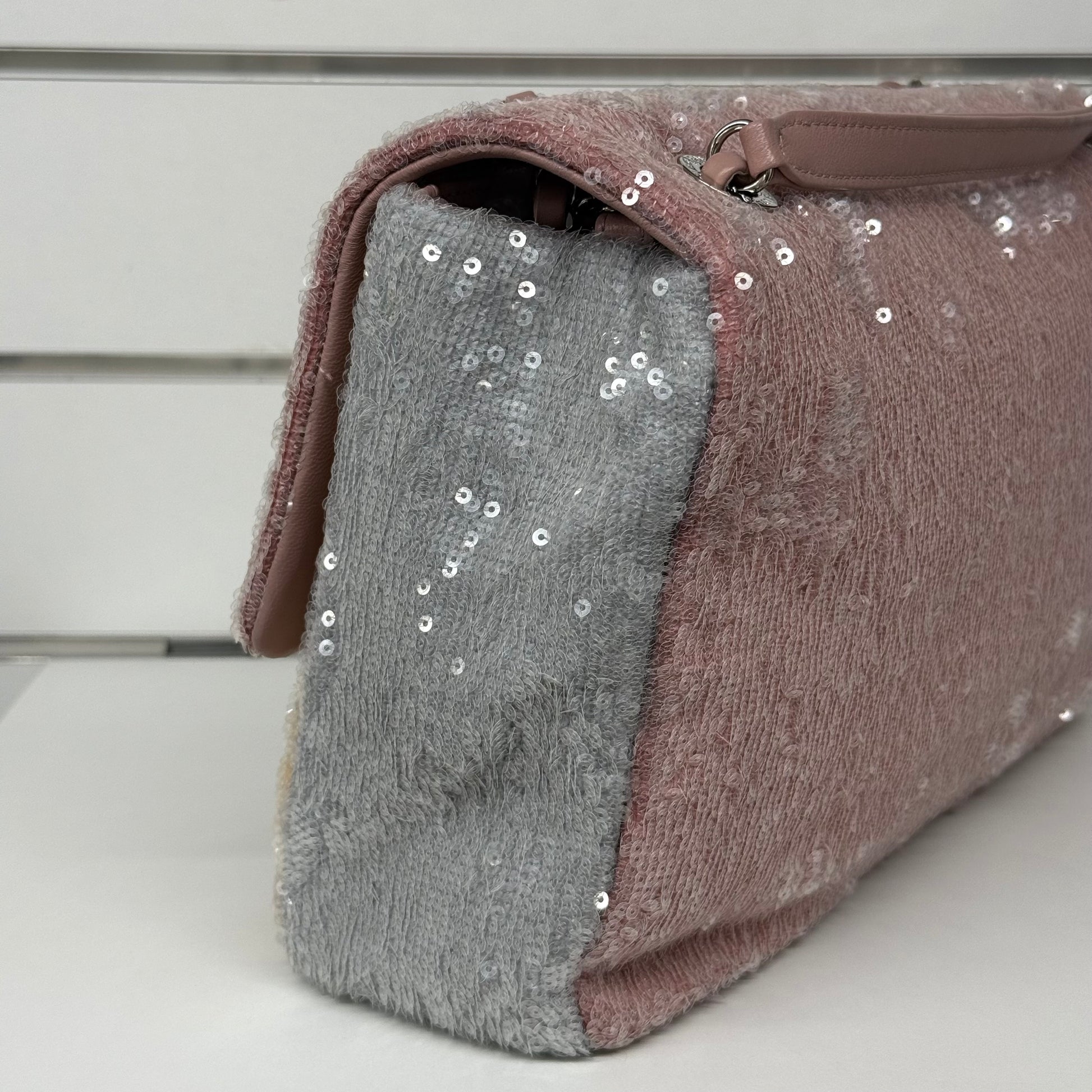 Sac Chanel Édition Limitée jumbo entièrement brodé de sequin, et bijouterie argent. Présence de l’hologramme. Il se porte à épaule.