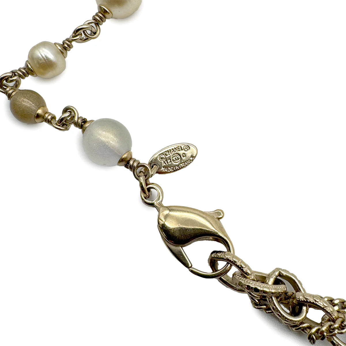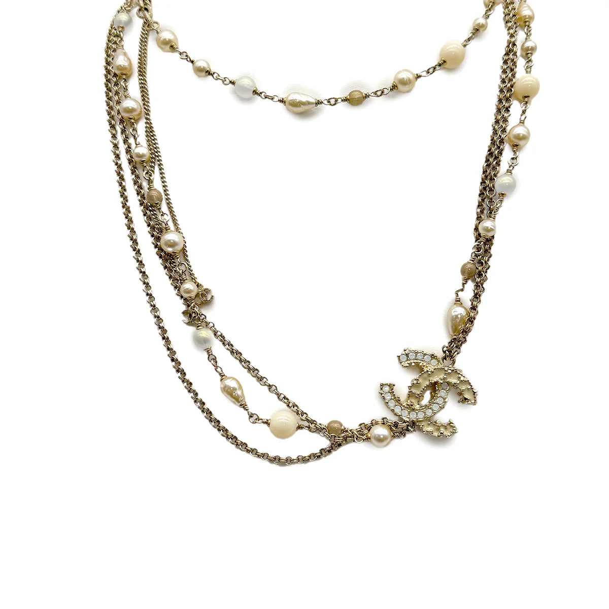 Sautoir long , double rangs , métal doré , perles Baroques et cristaux , collection 2012