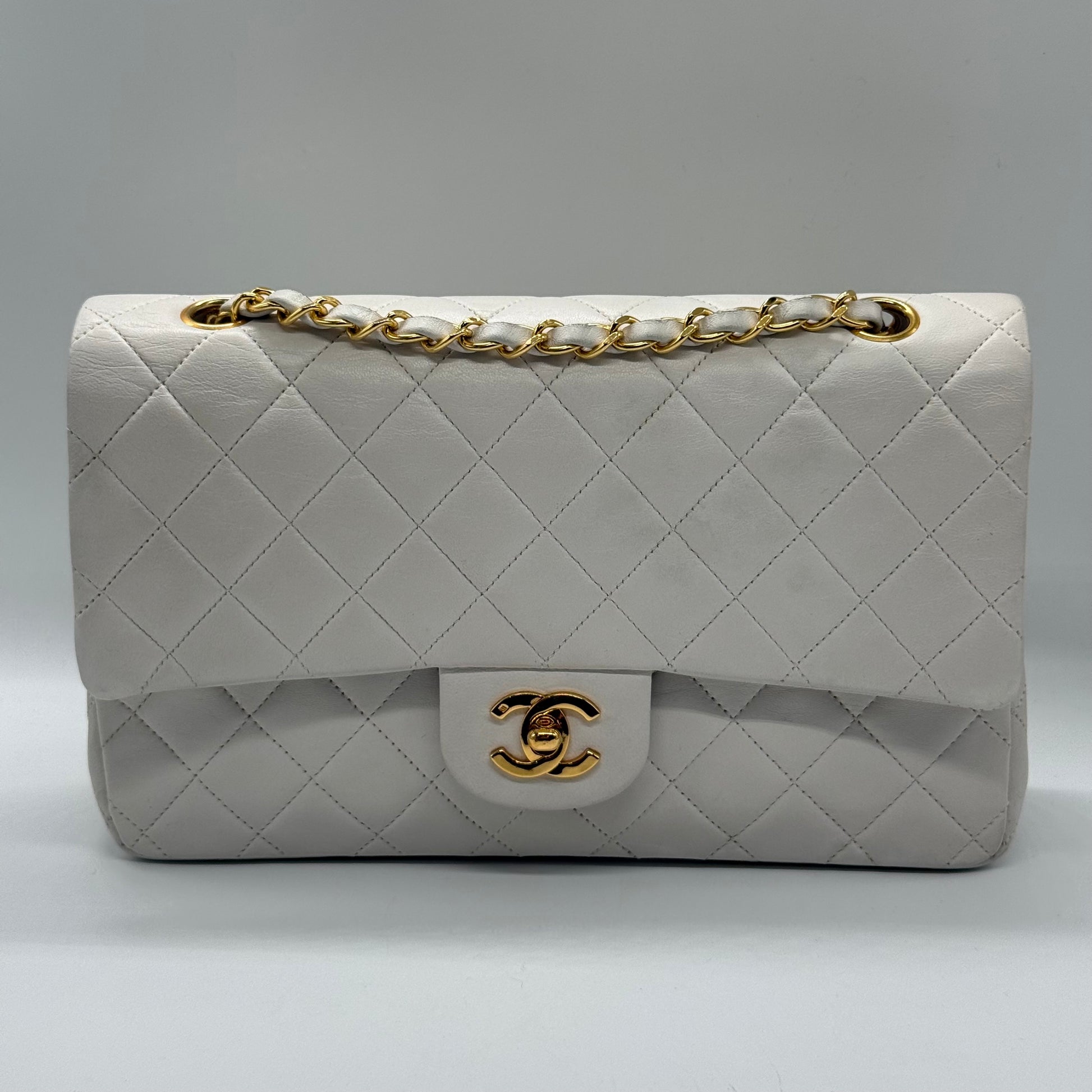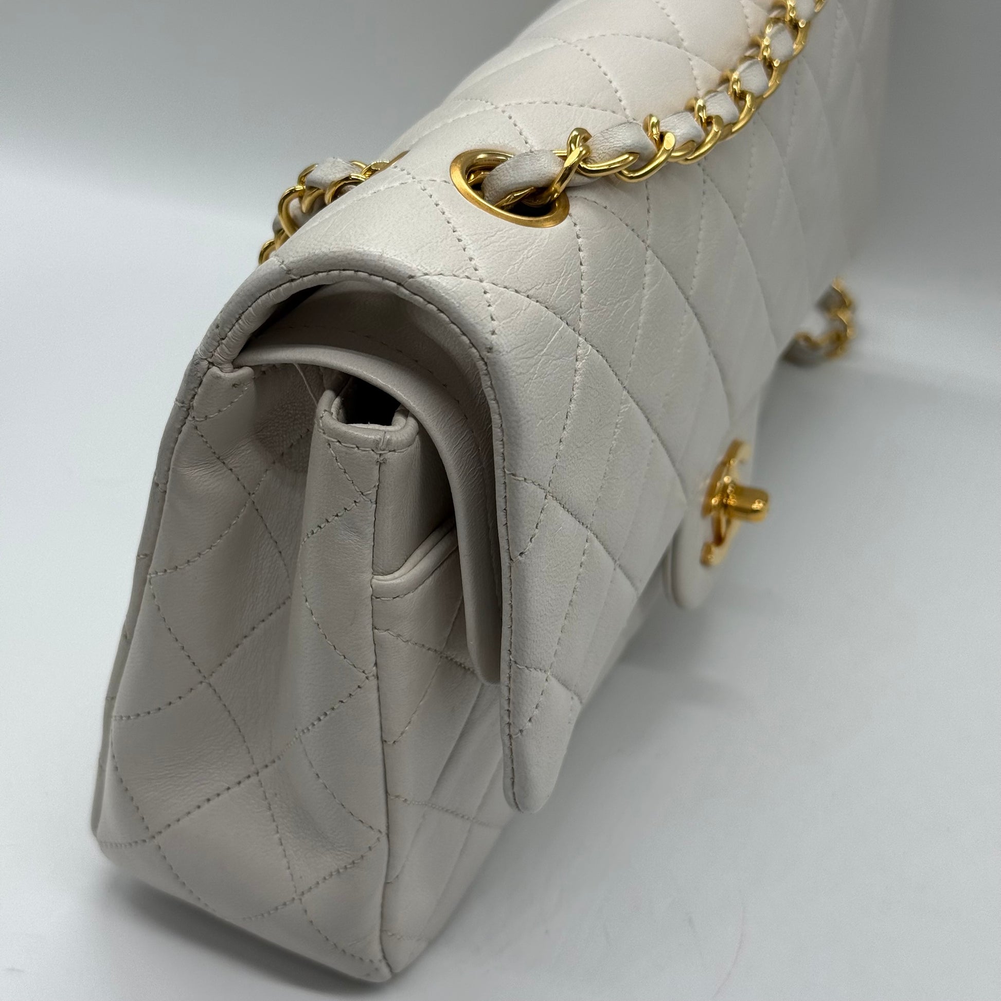 Sac Chanel classique en cuir d'agneau blanc et bijouterie en plaqué or.