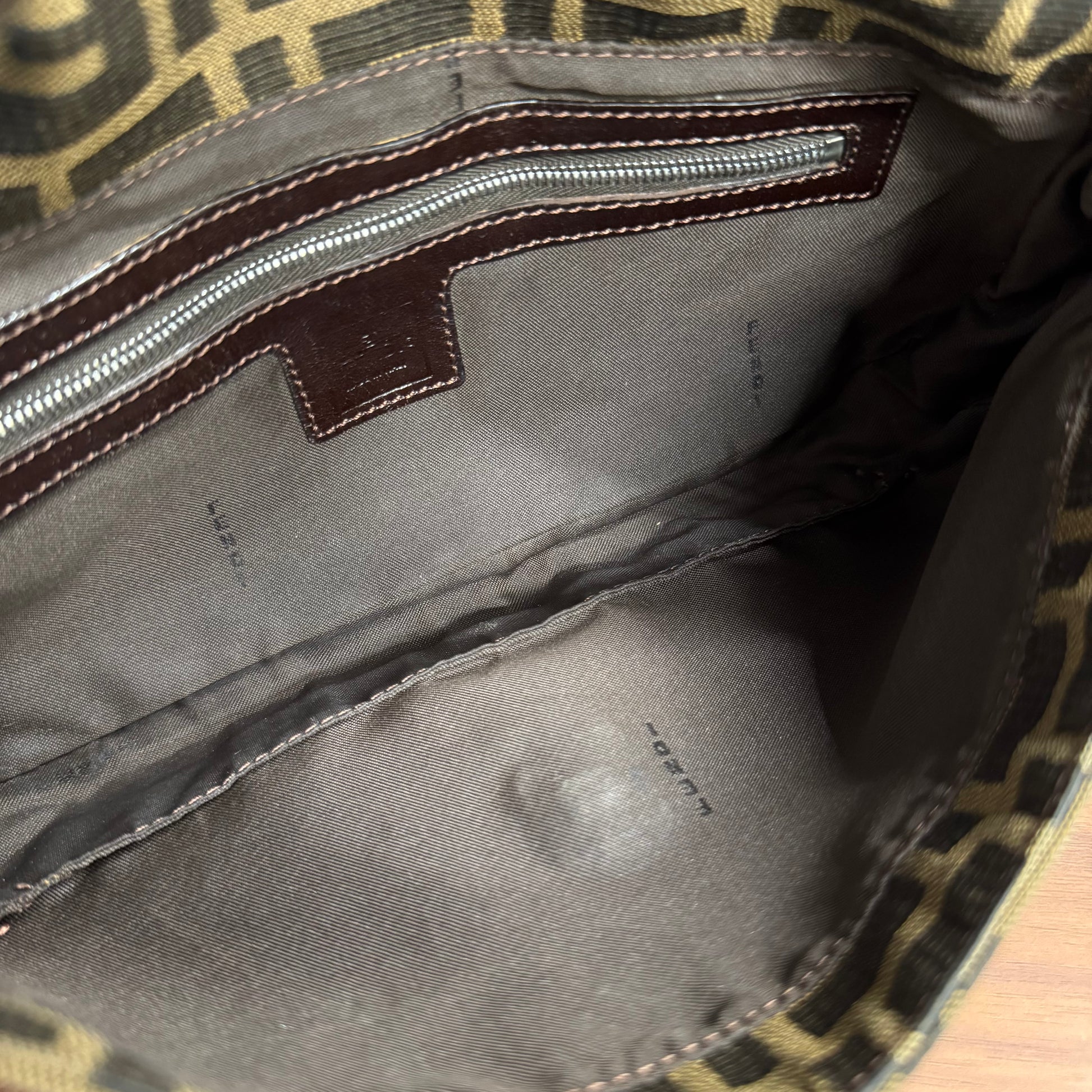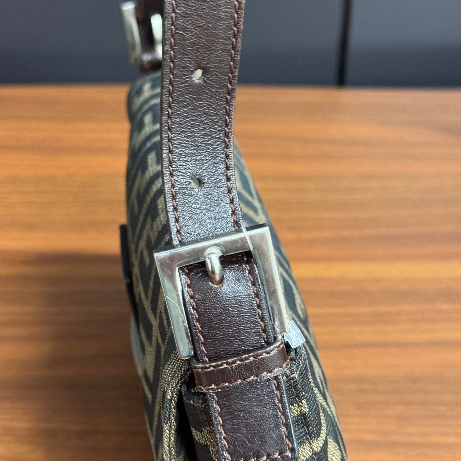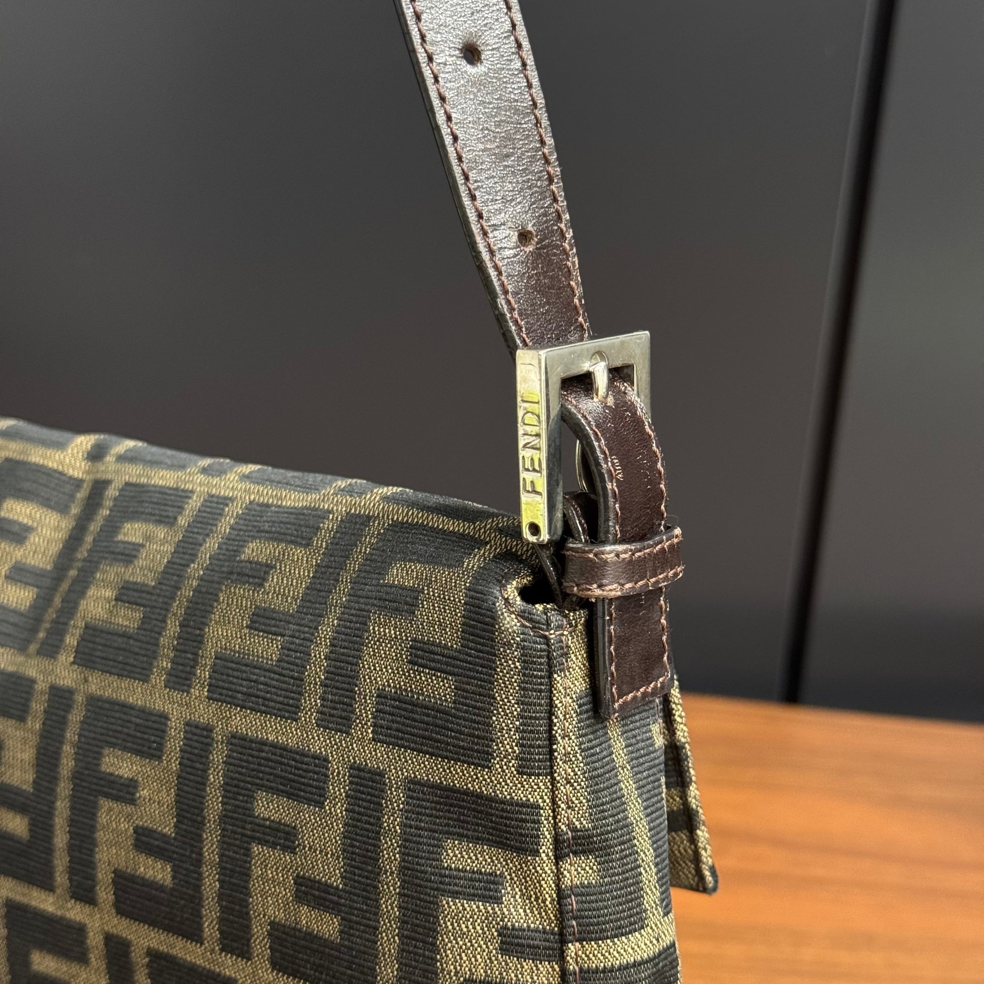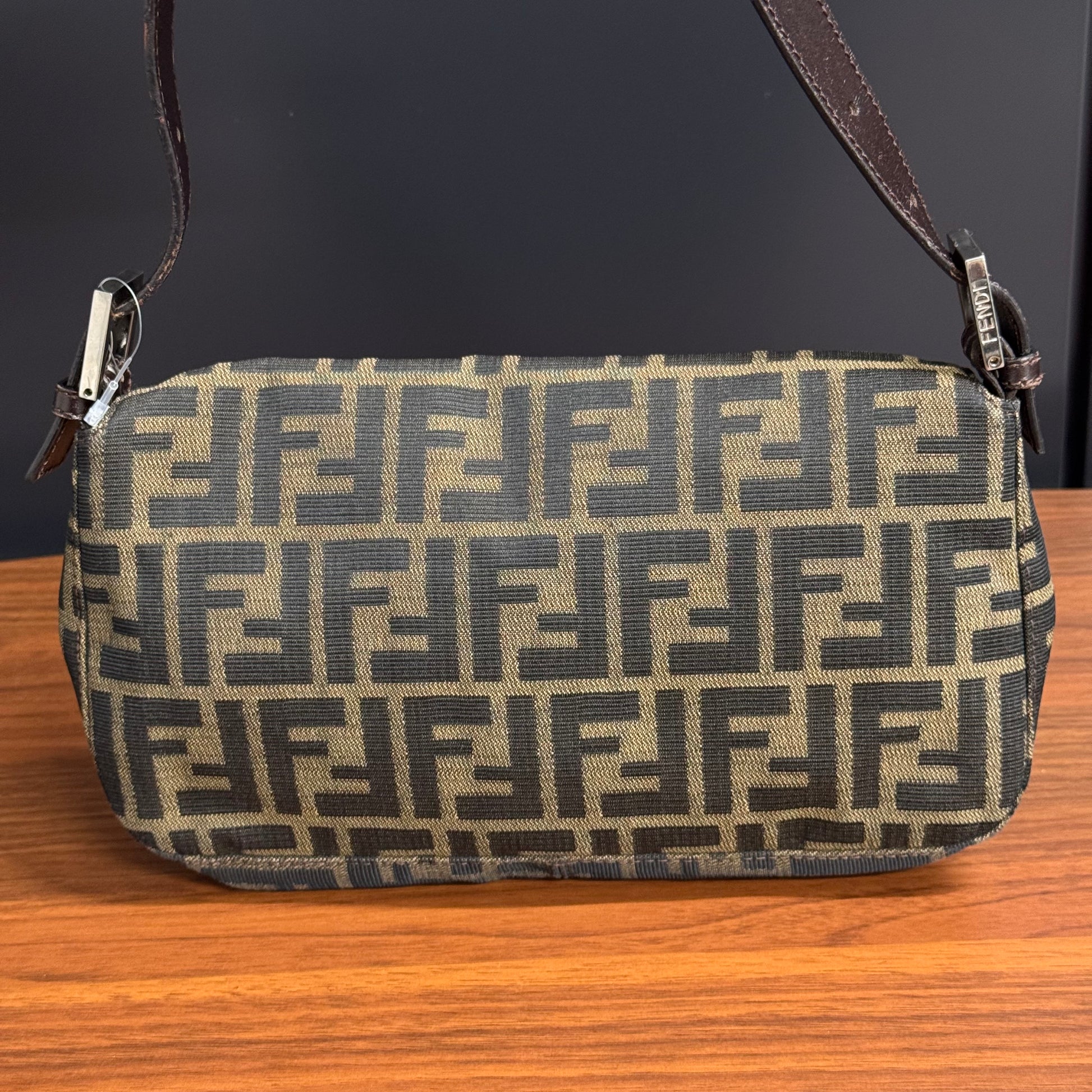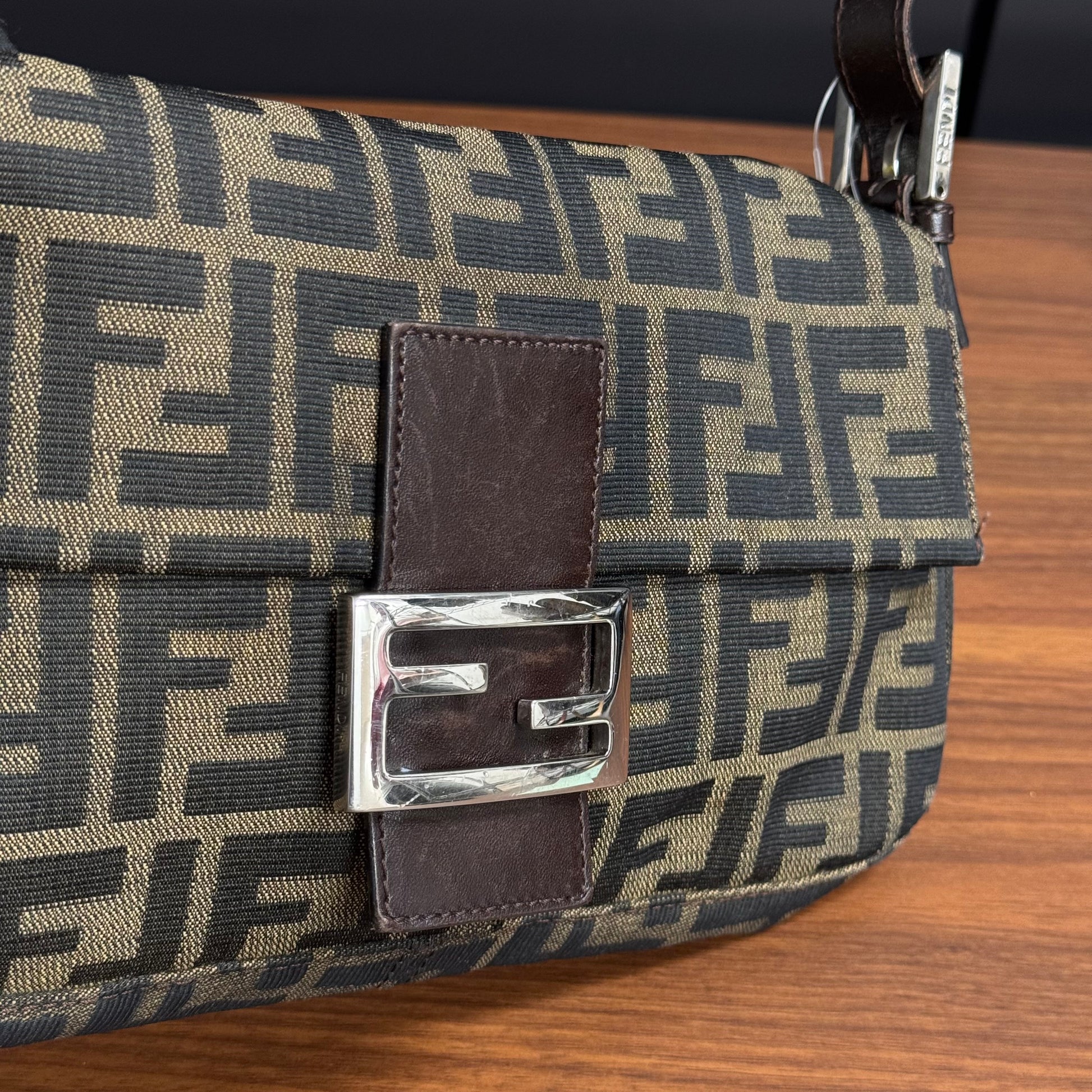 Baguette Fendi en toile Jacquard et cuir. Ce modèle se porte à la main.