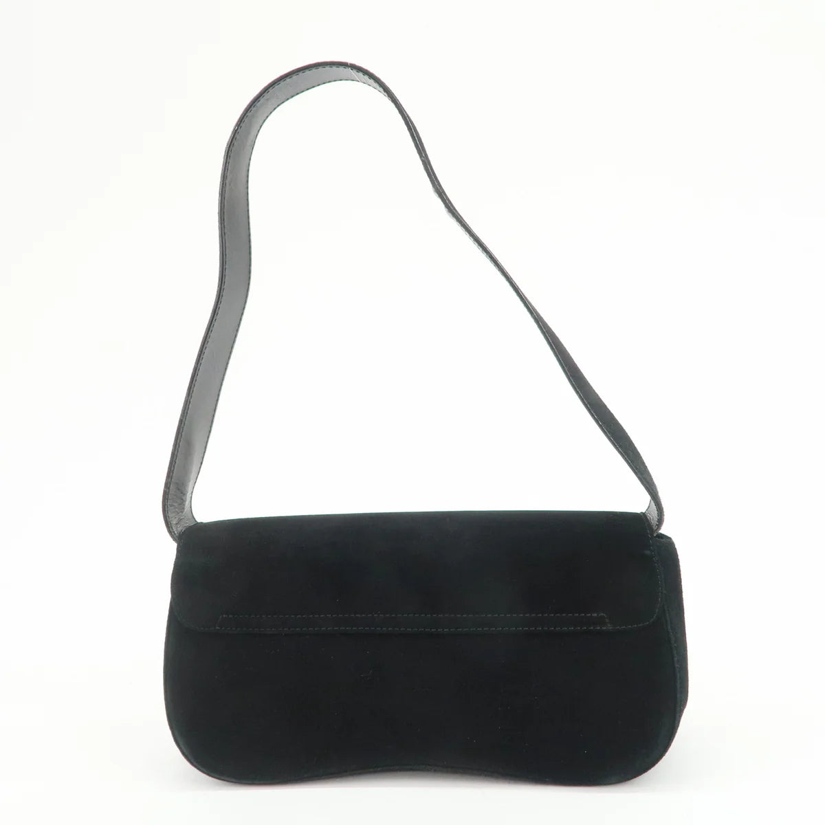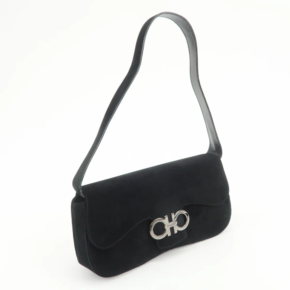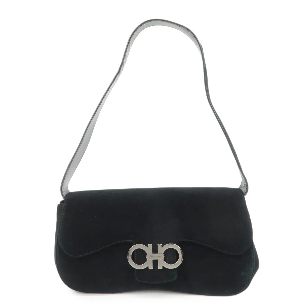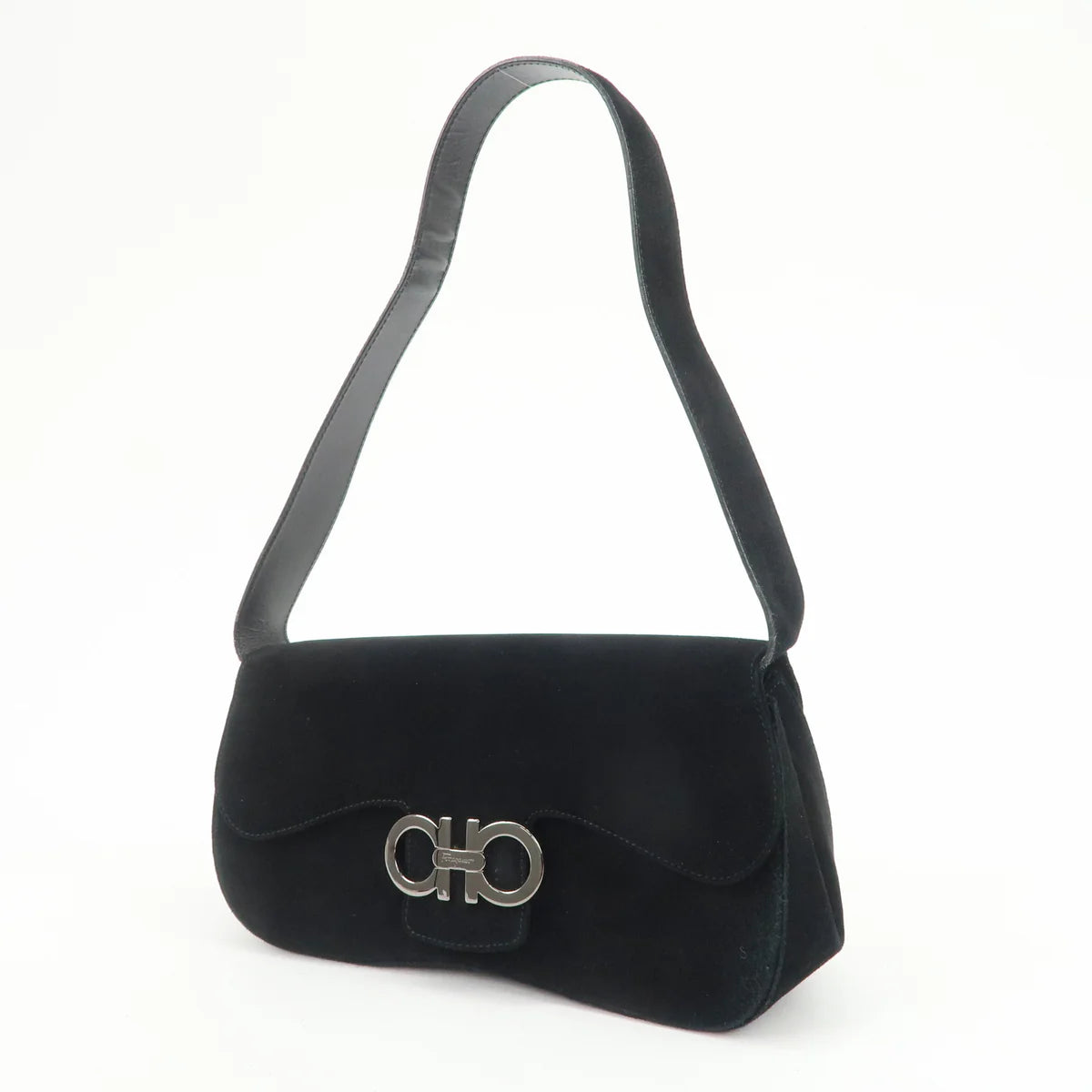 Grand sac Baguette Gancini en veau velours noir et large boucle Gancini en métal argenté brossé , porté épaule .