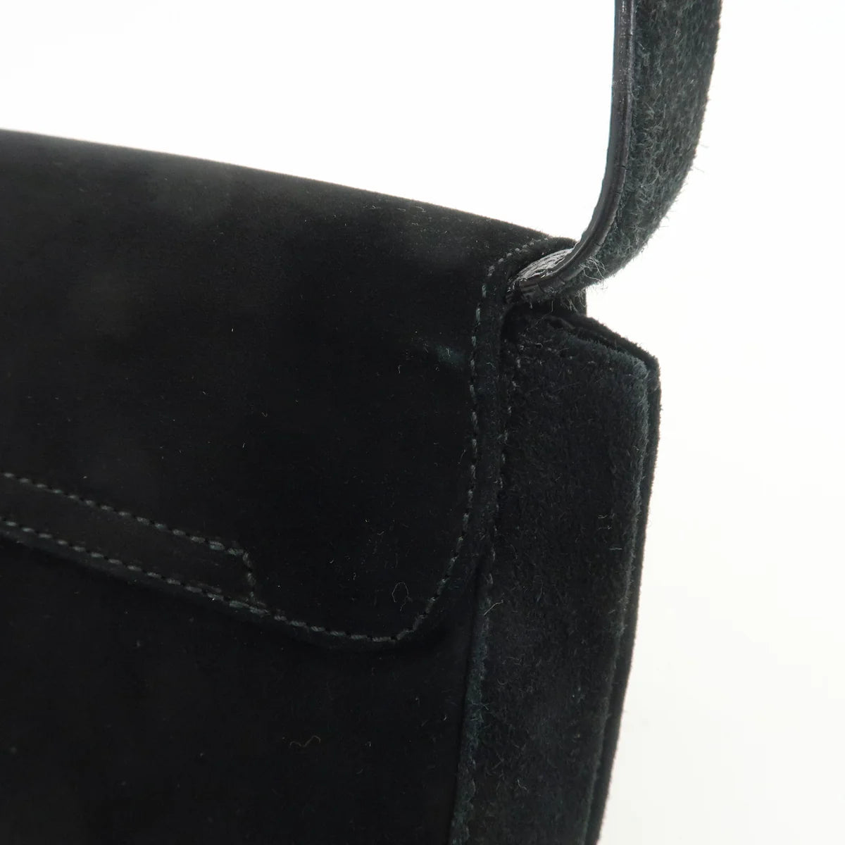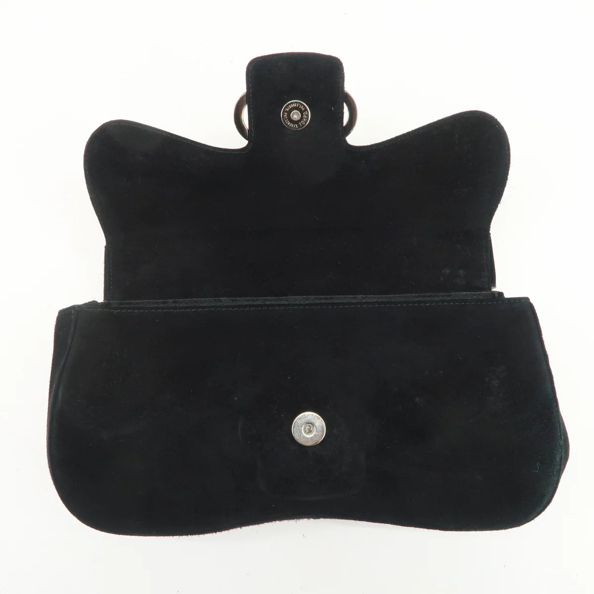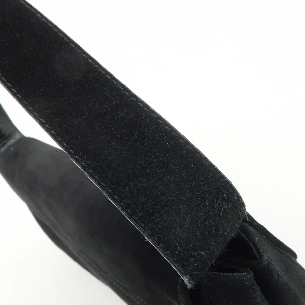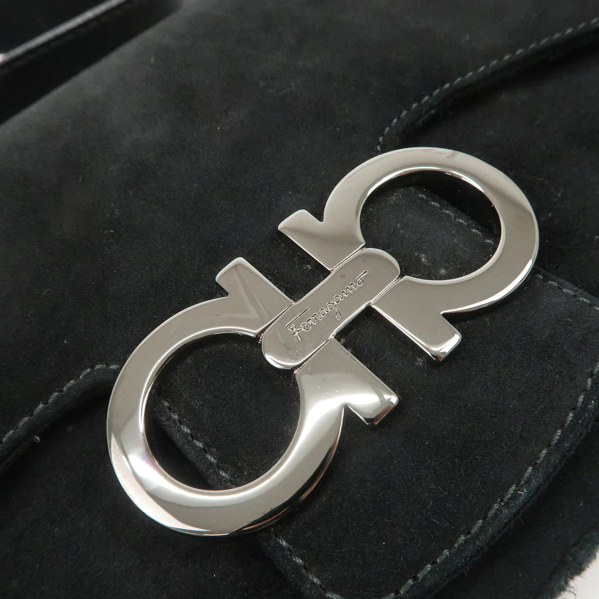 Grand sac Baguette Gancini en veau velours noir et large boucle Gancini en métal argenté brossé , porté épaule .