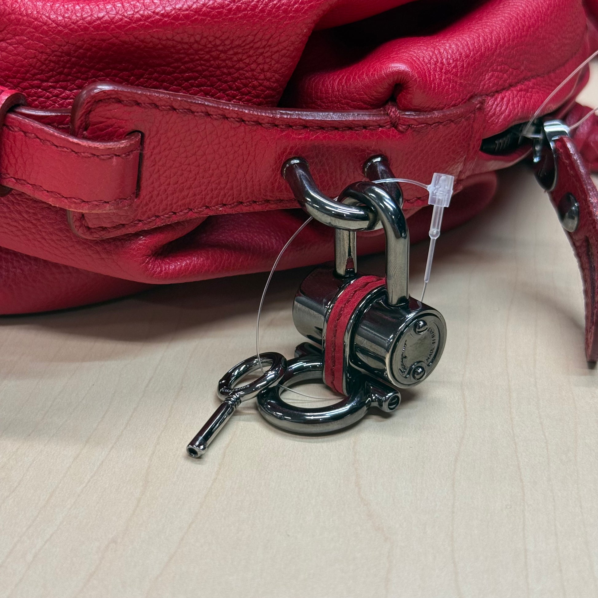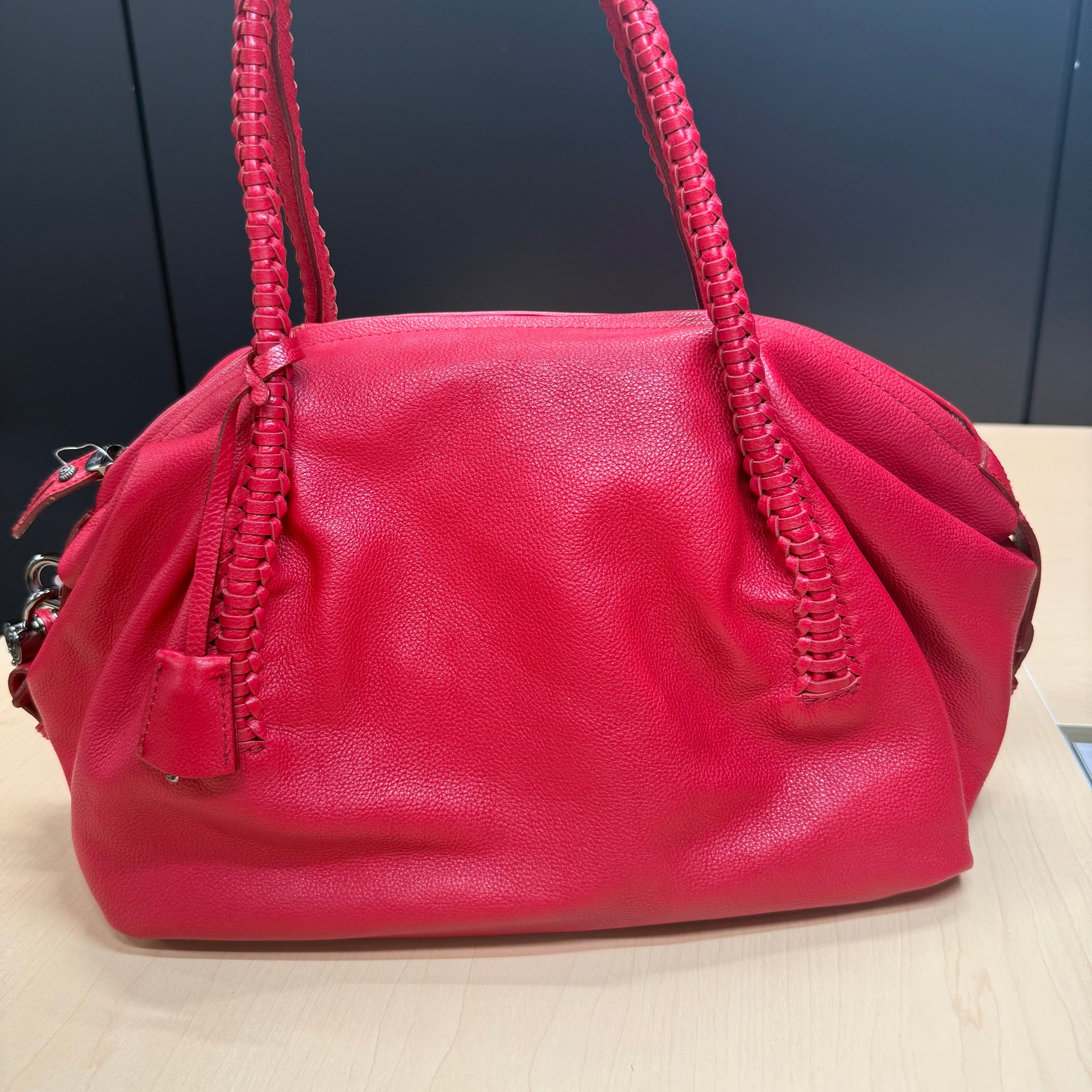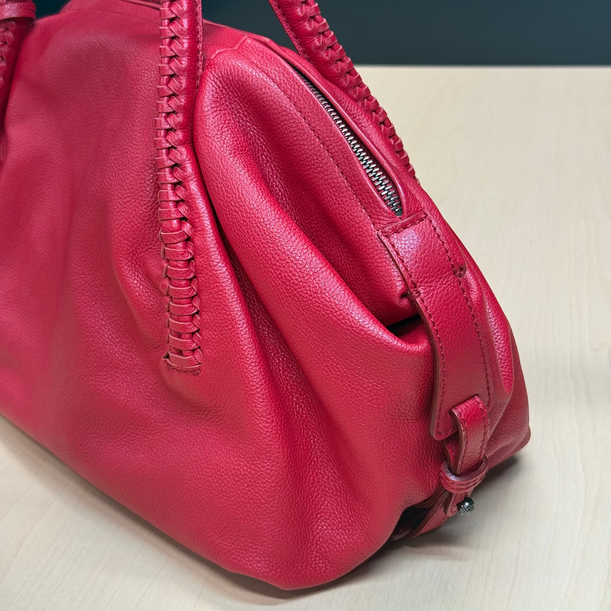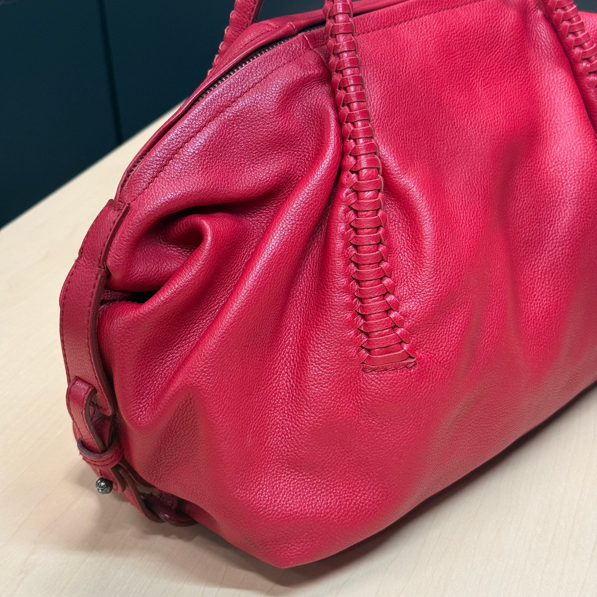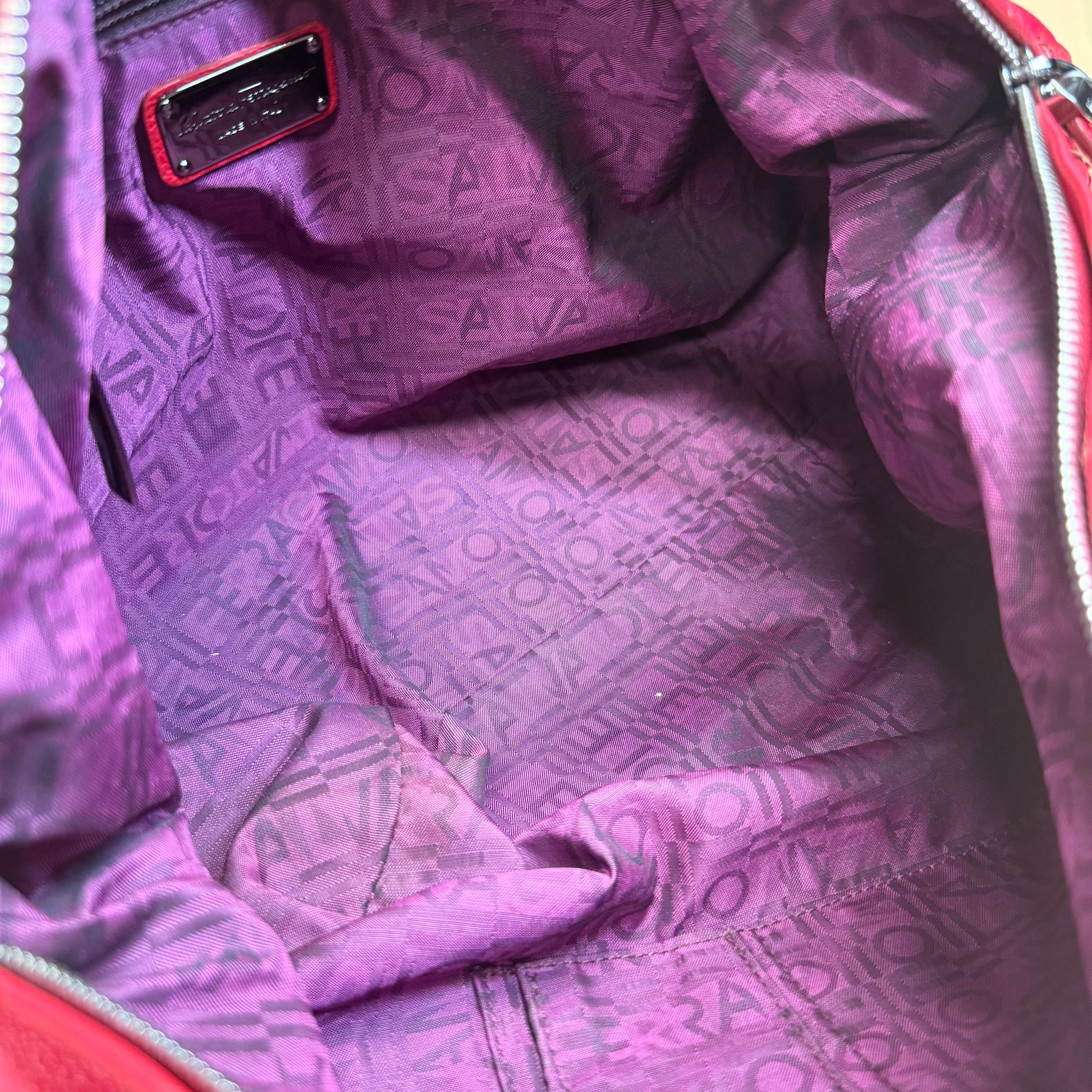 Sac Ferragamo en cuir de veau grainé rouge, porté épaule.
