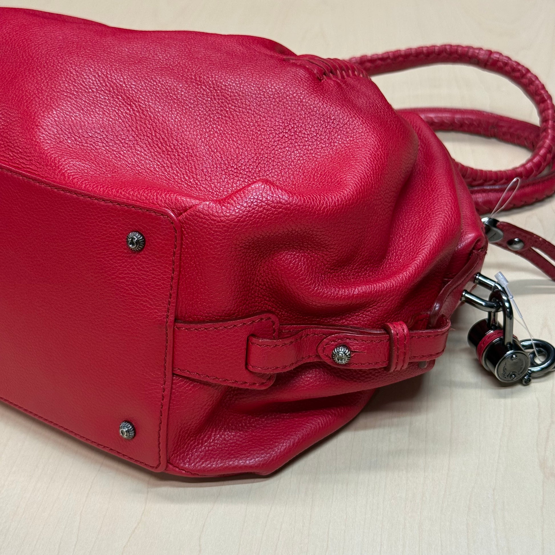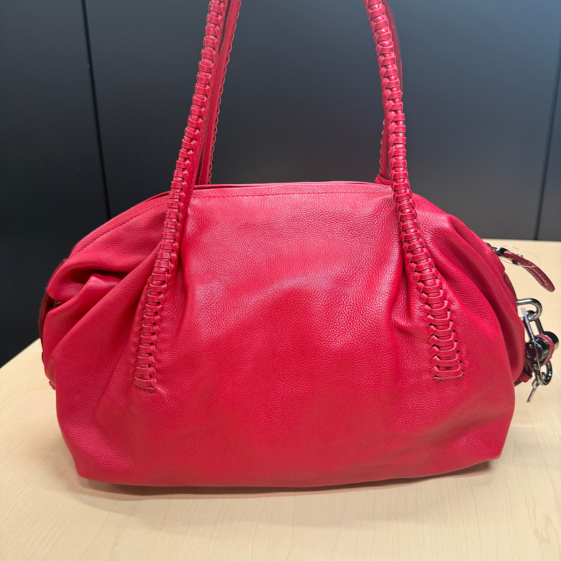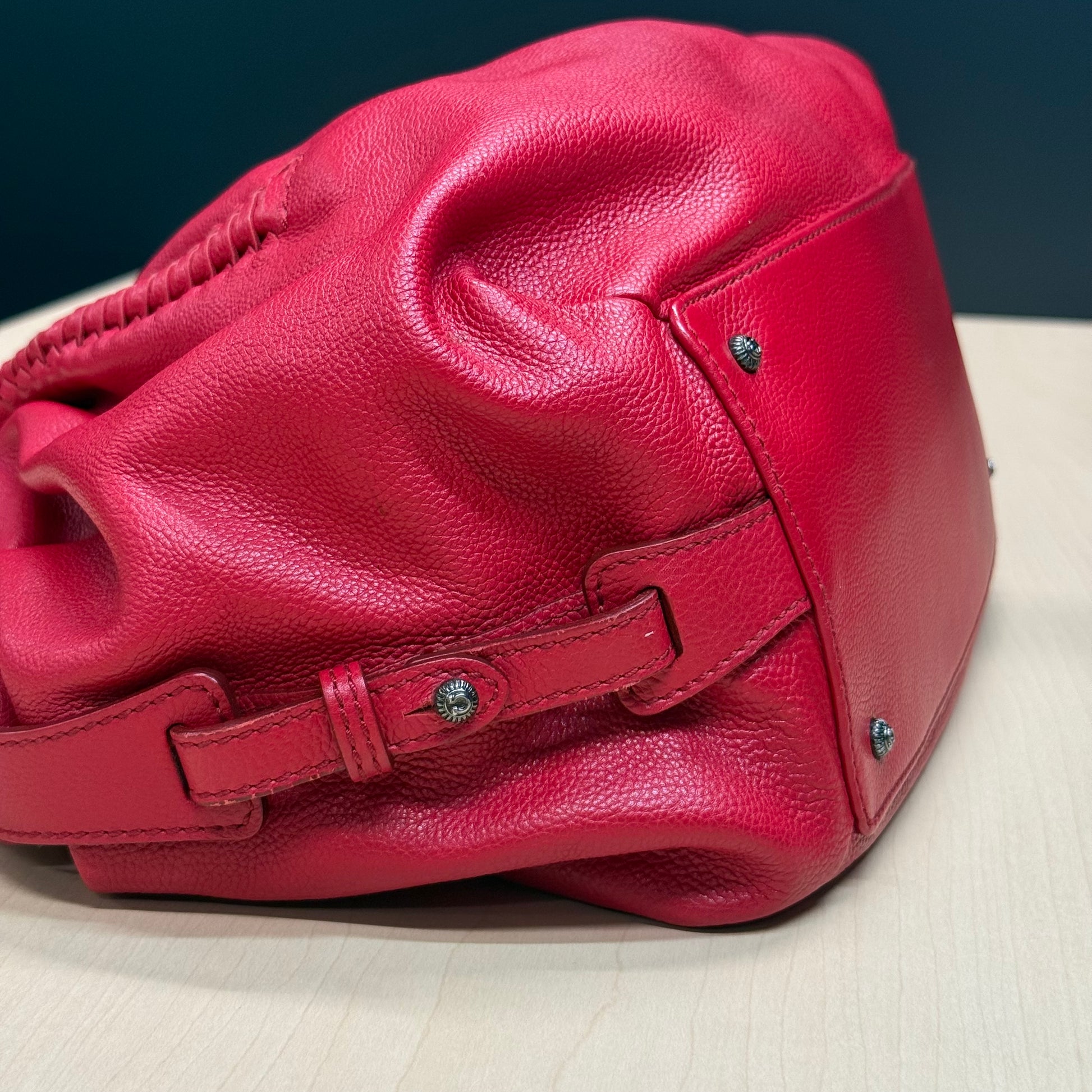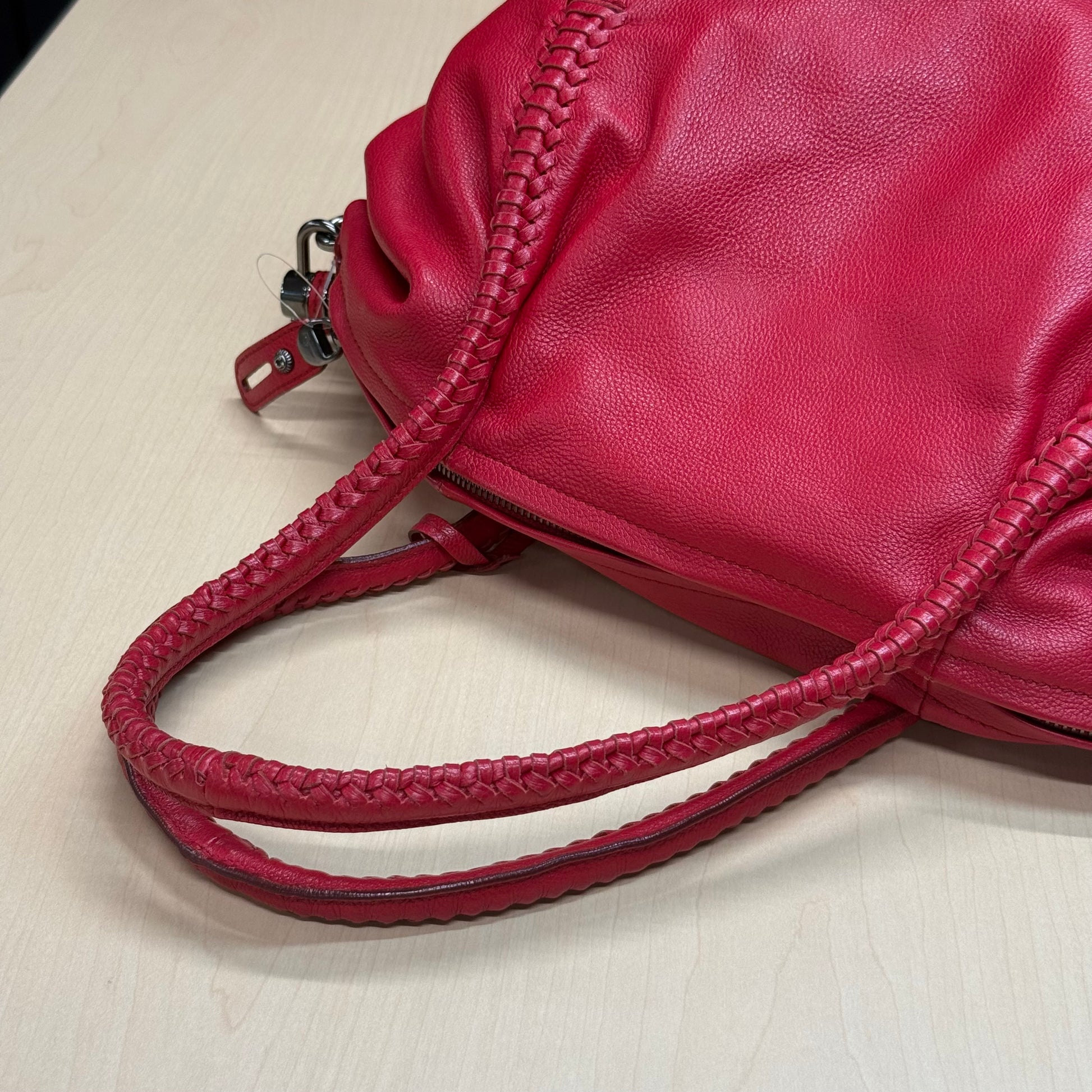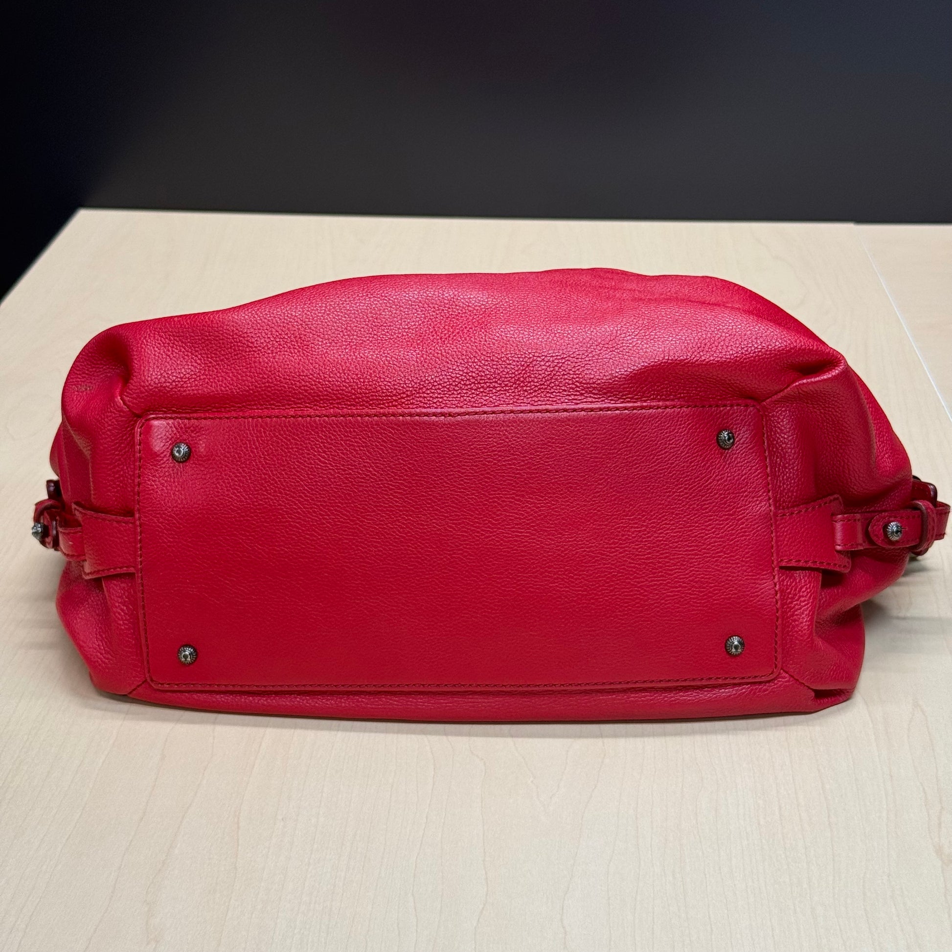 Sac Ferragamo en cuir de veau grainé rouge, porté épaule.