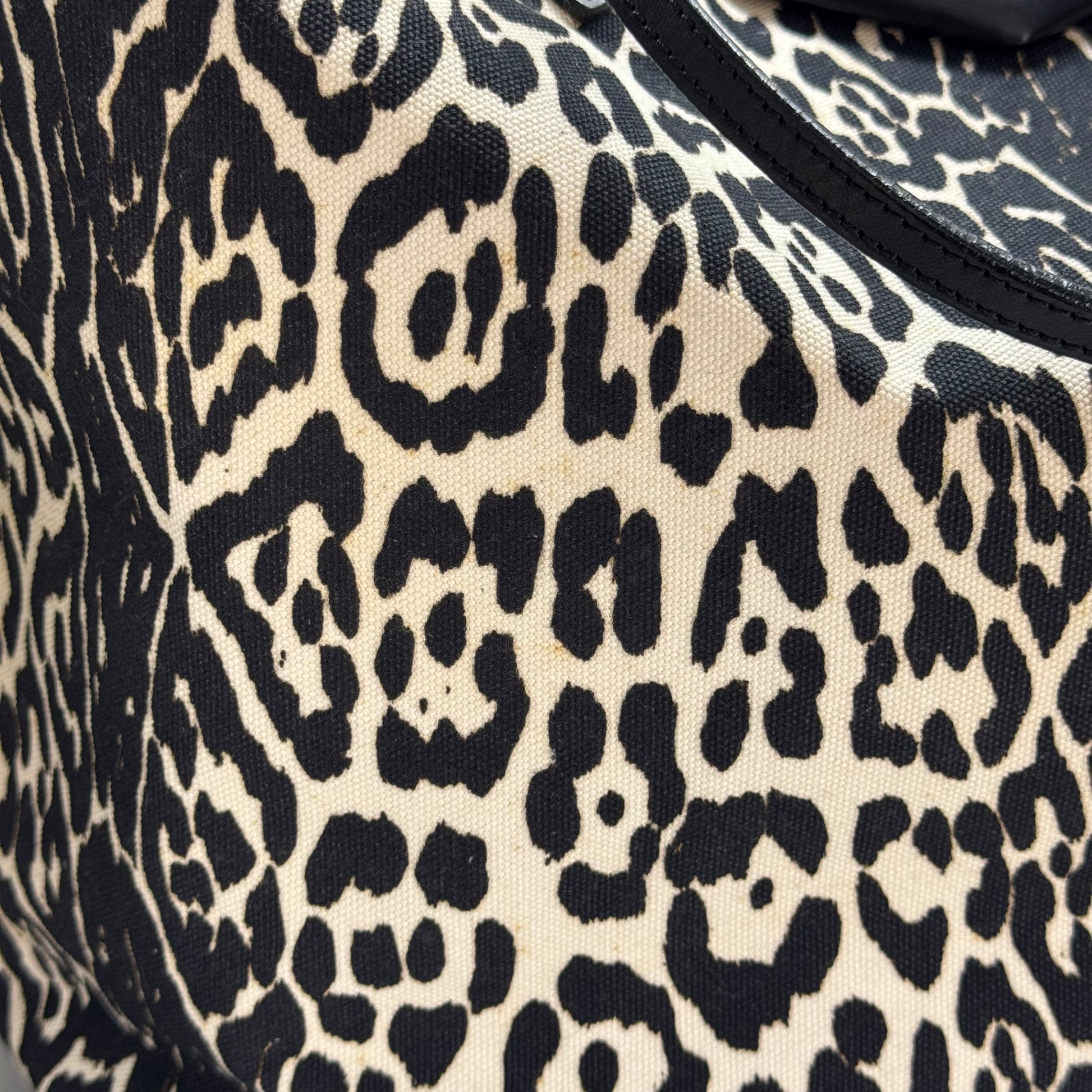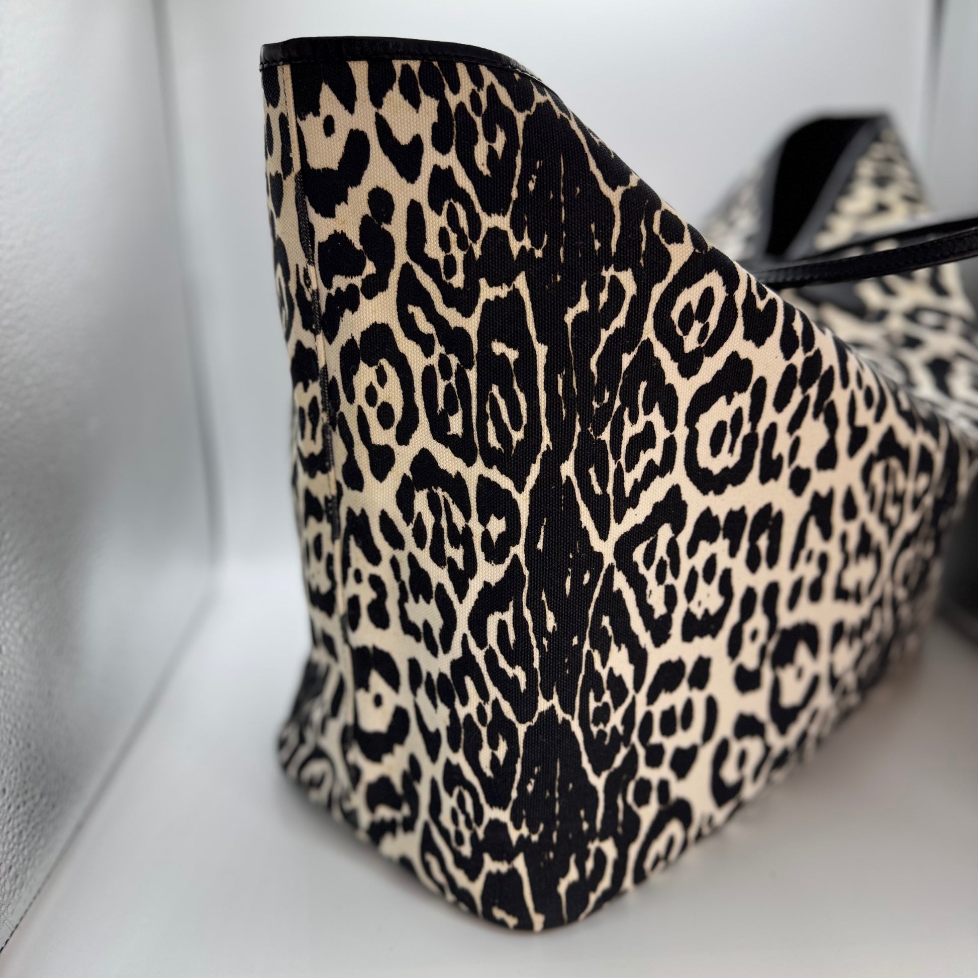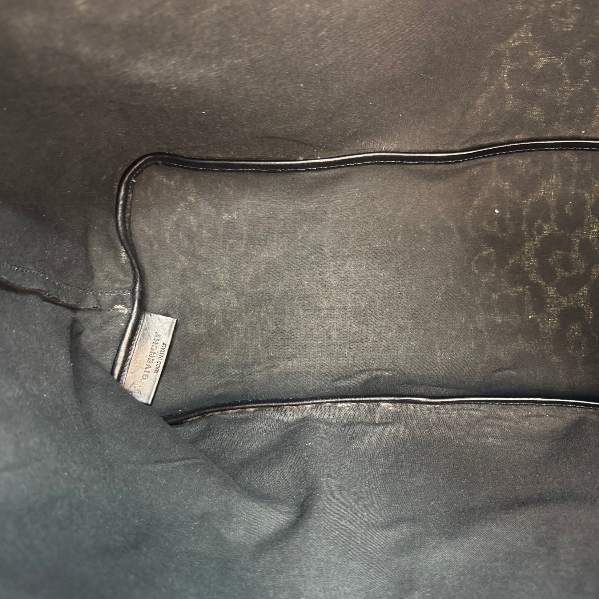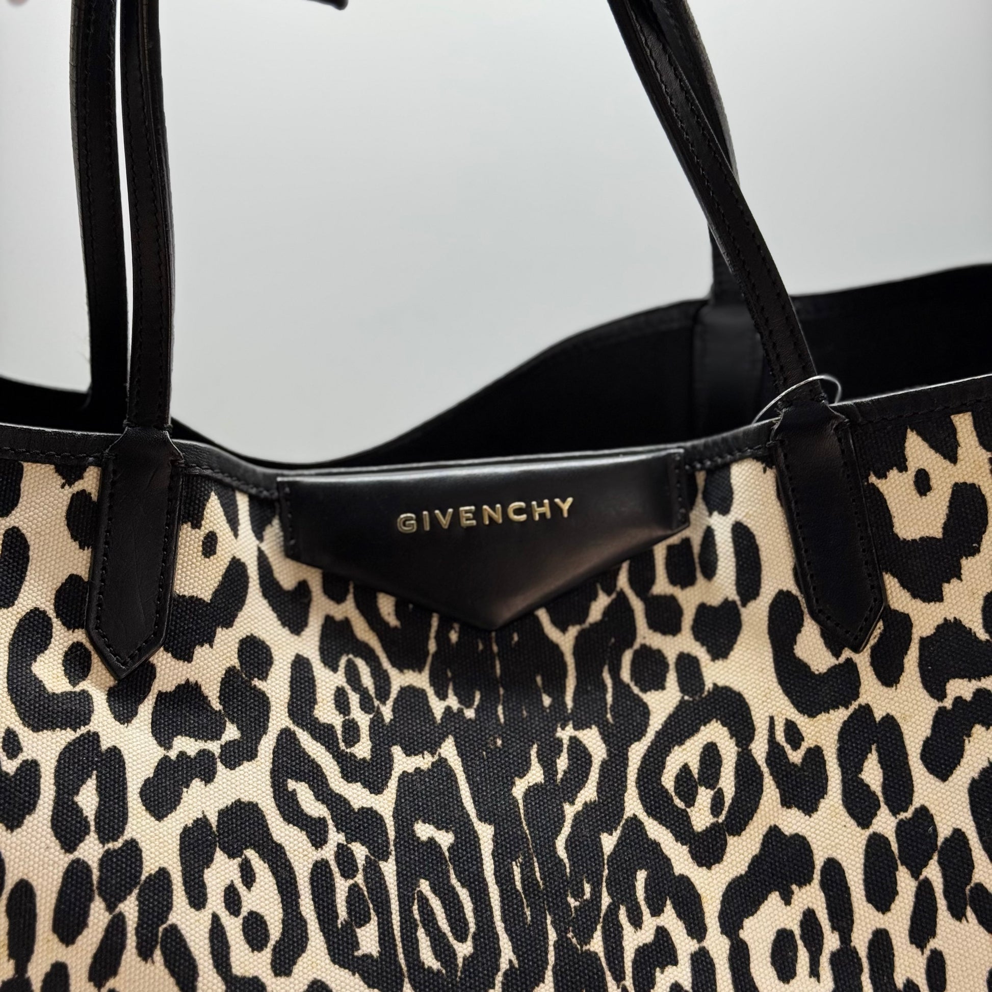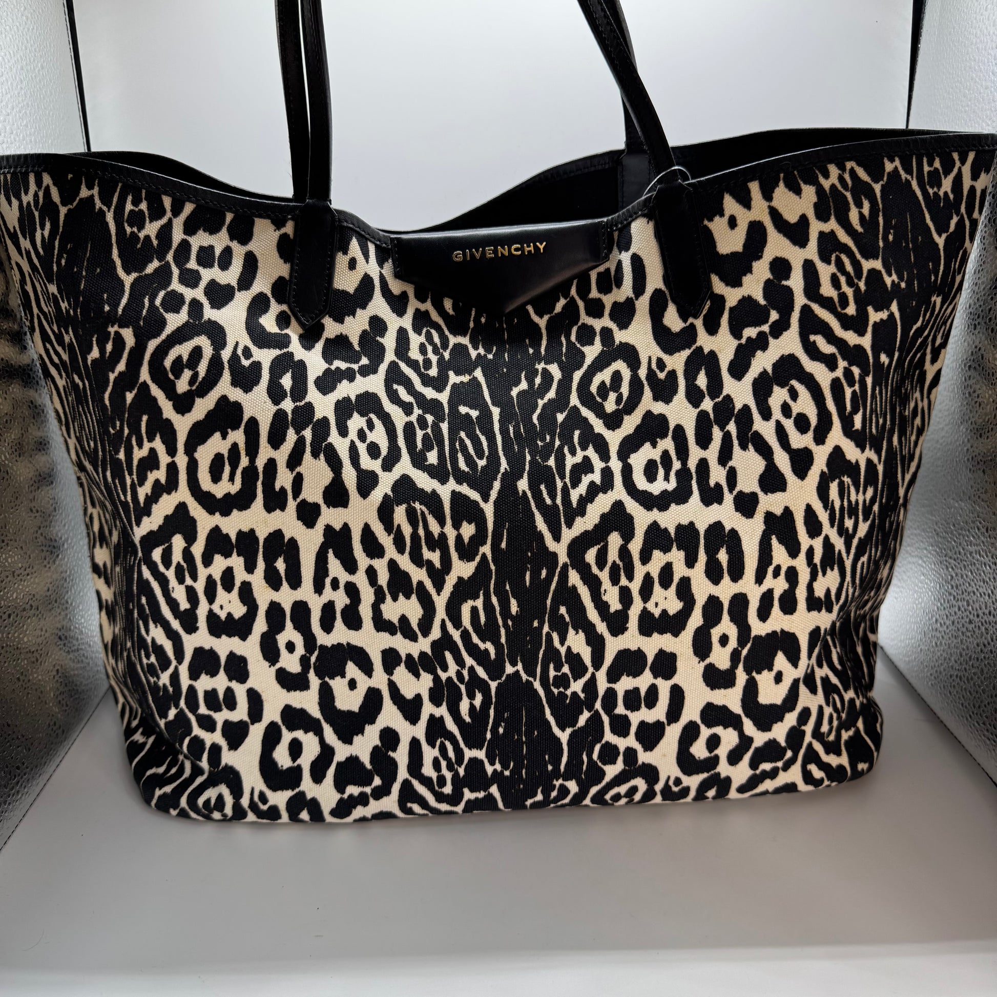 Sac shopping Givenchy, en toile imprimé léopard et finition en cuir noir. Le logo Givenchy embossé en métal doré. Il se porte à la main.