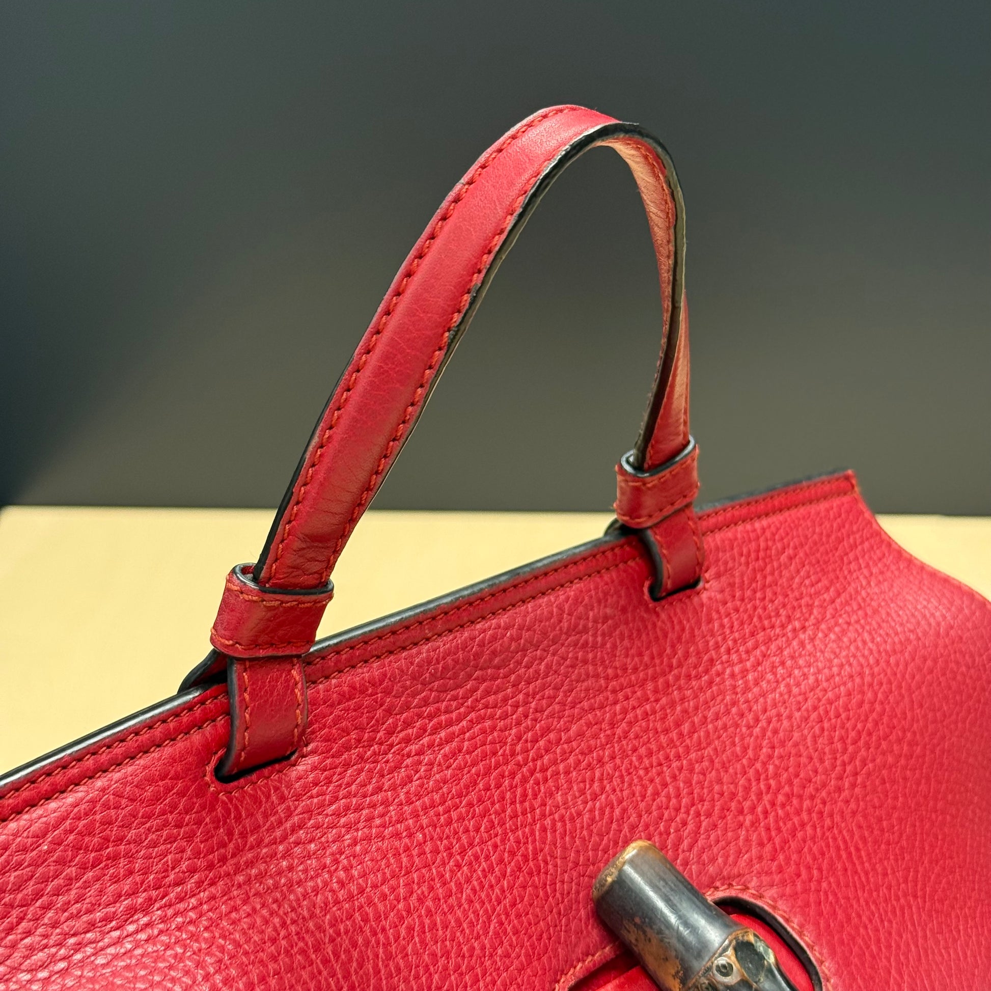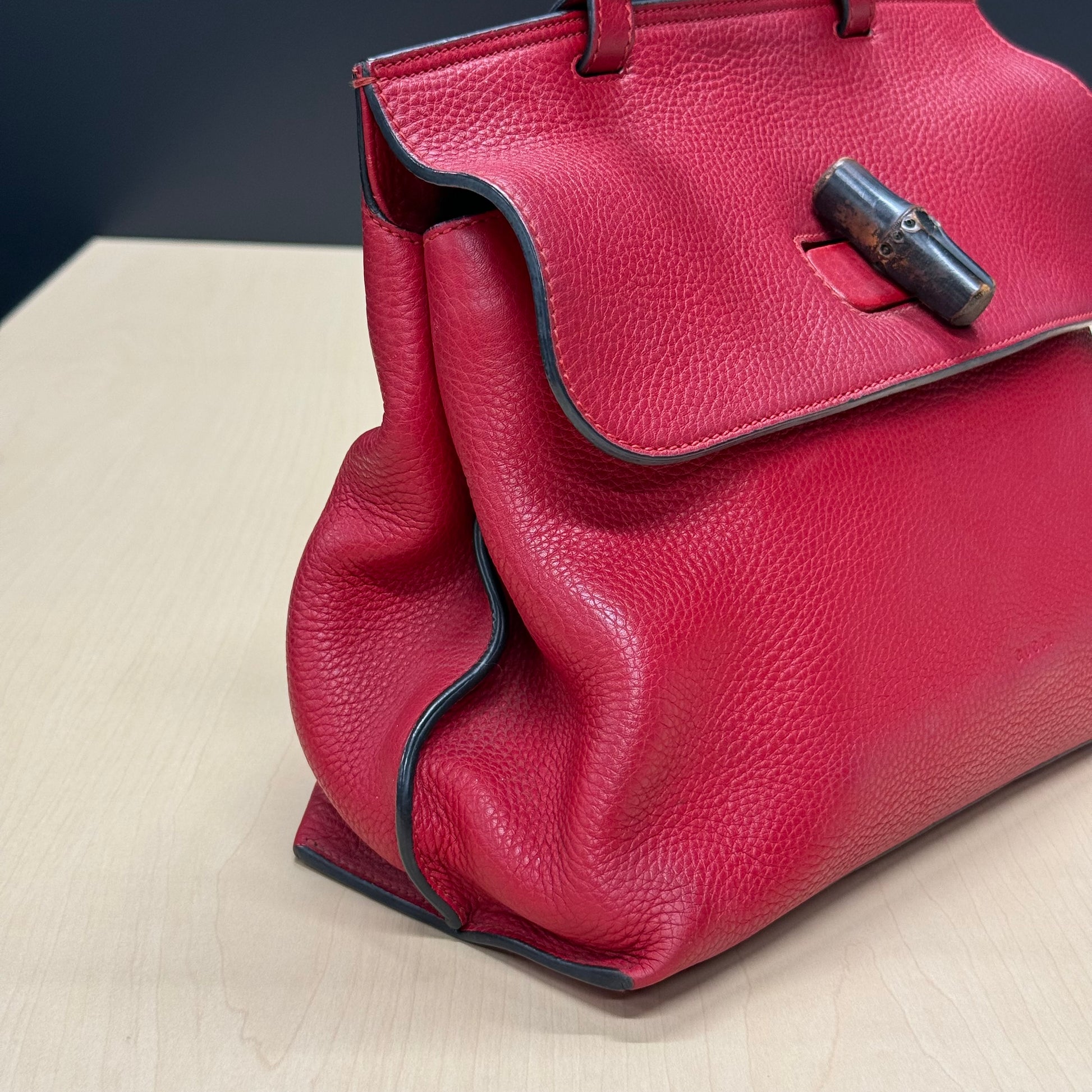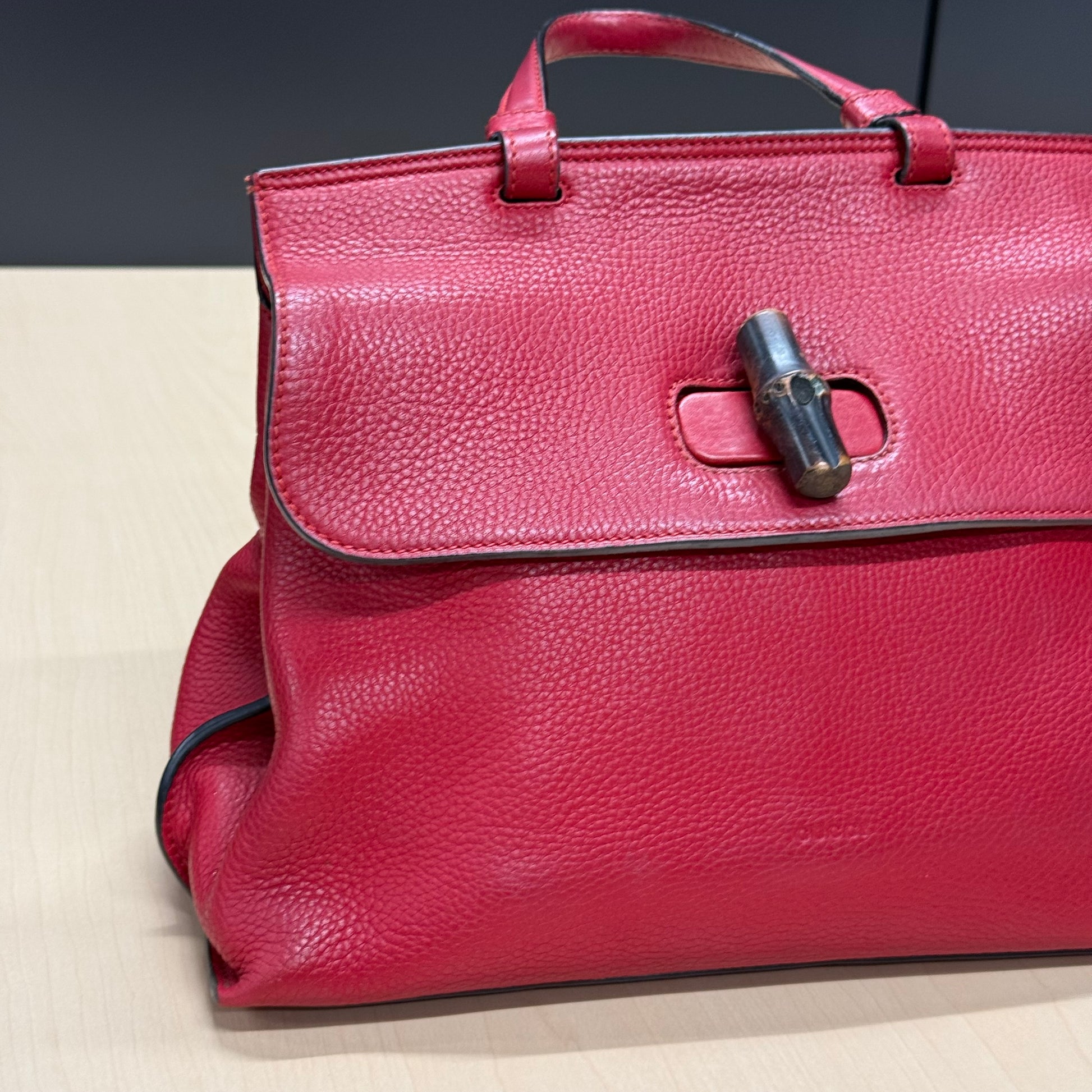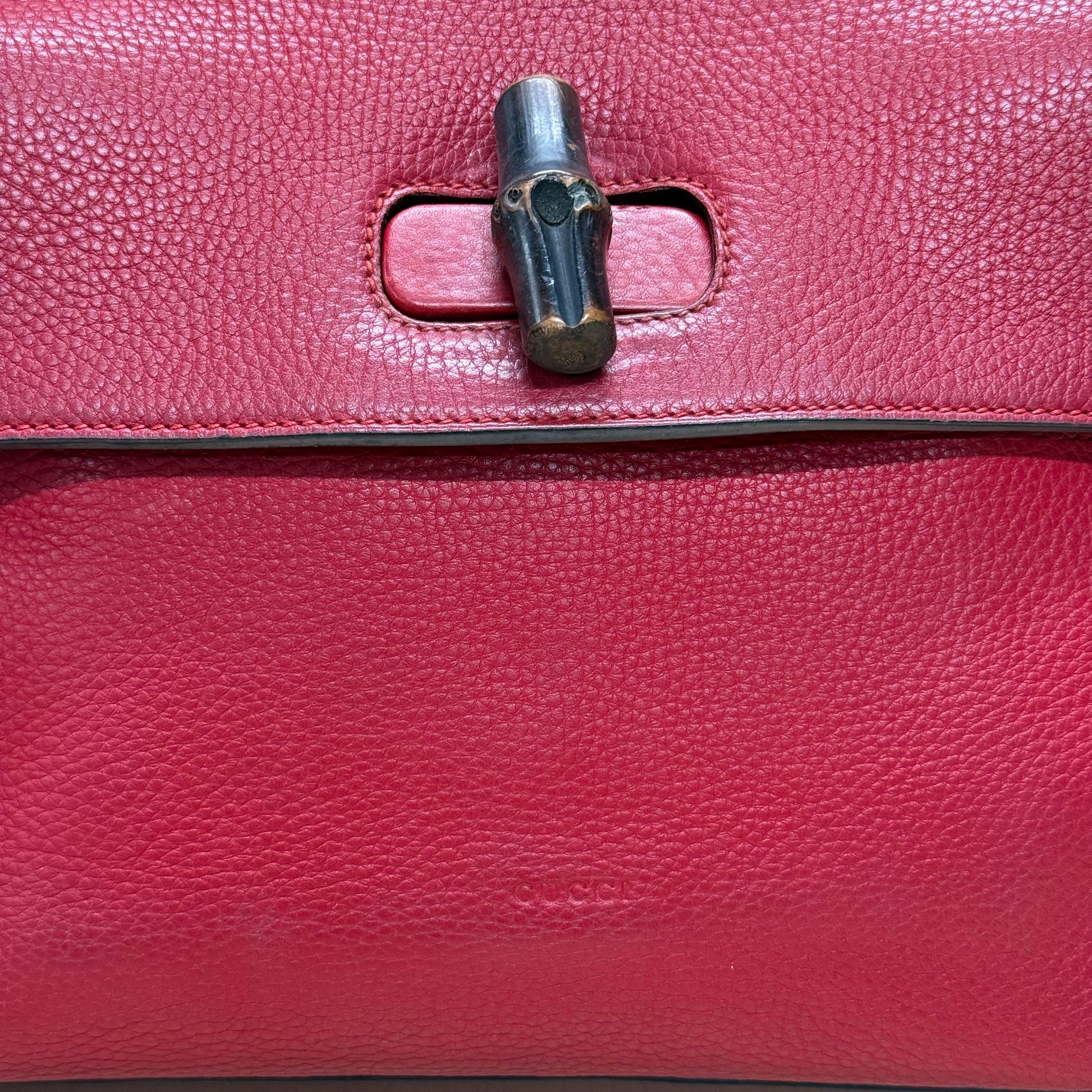 Sac Gucci en cuir de veau grainé rouge et fermoir bamboo.