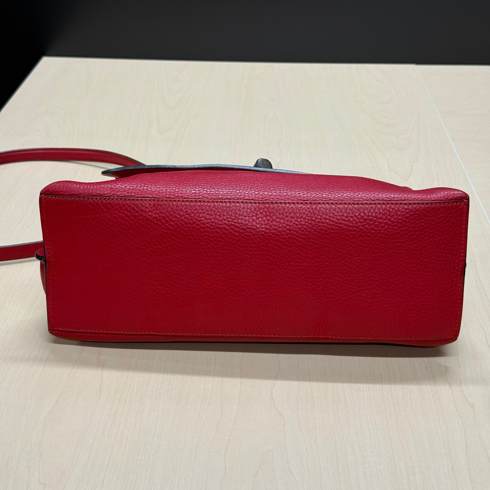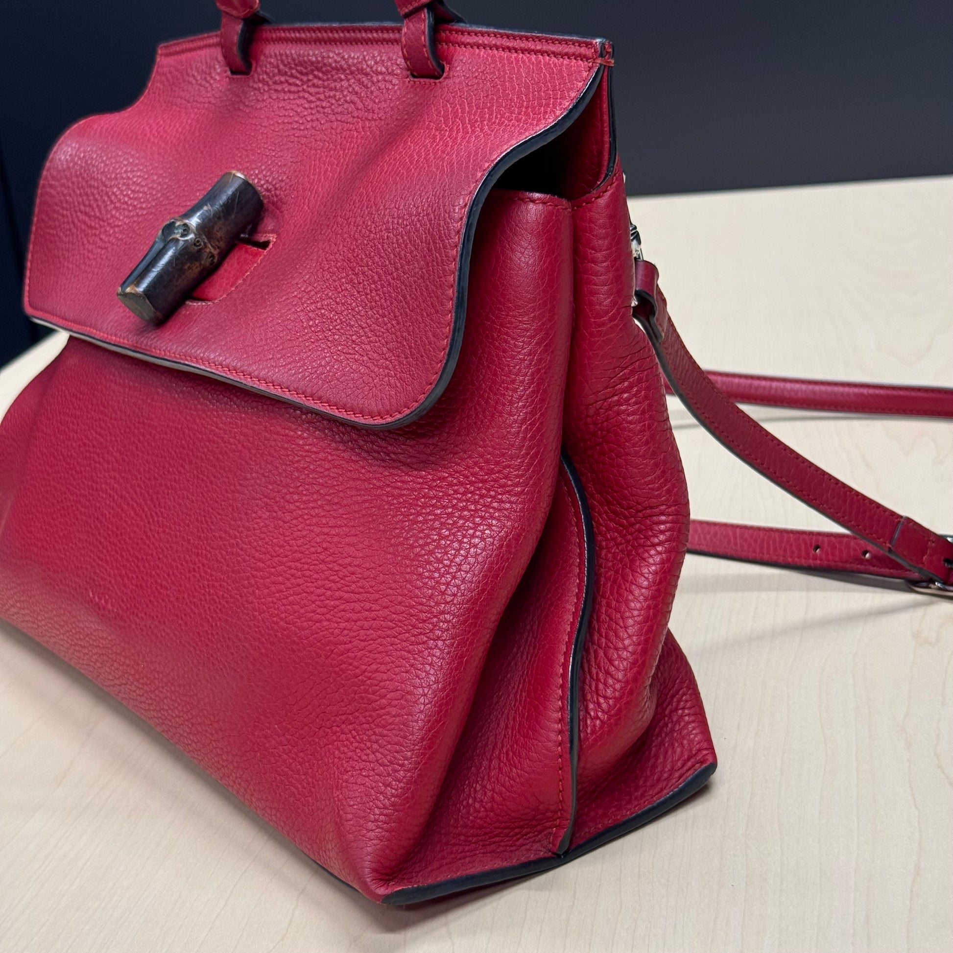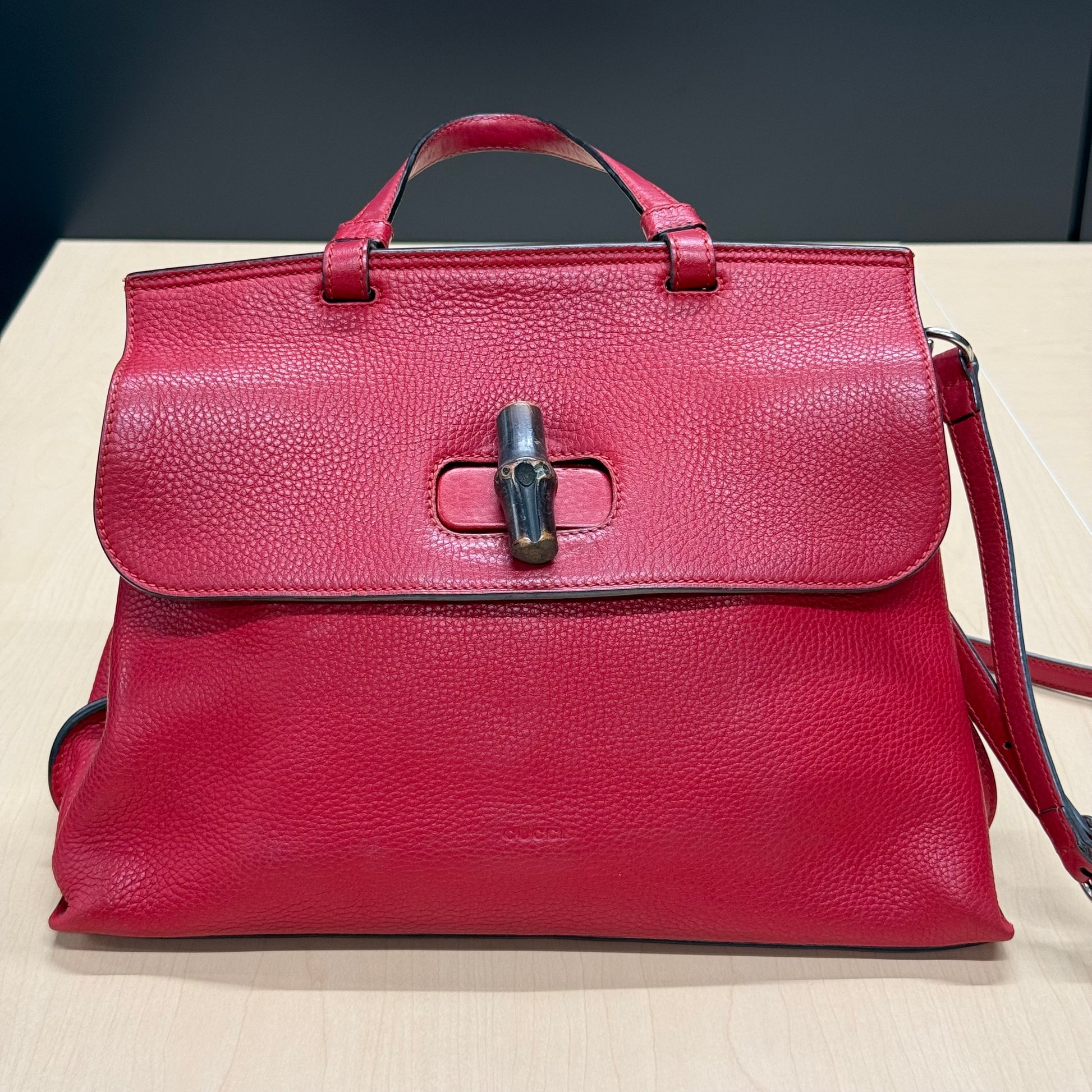 Sac Gucci en cuir de veau grainé rouge et fermoir bamboo.