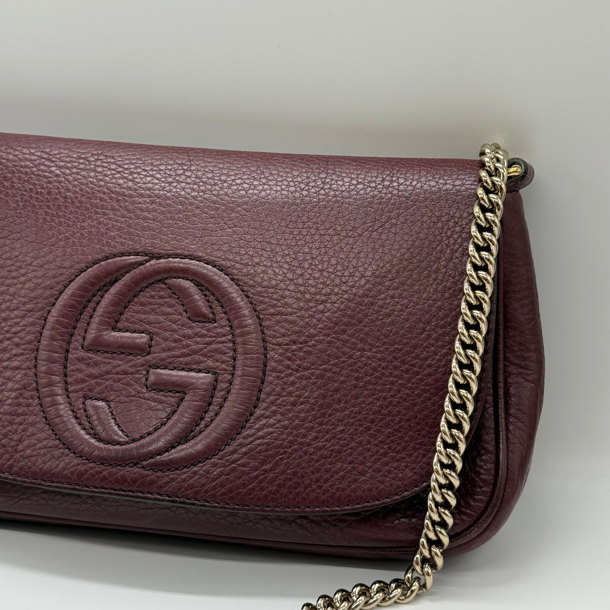 Sac Gucci style Soho bandoulière en cuir de veau grainé burgundy.