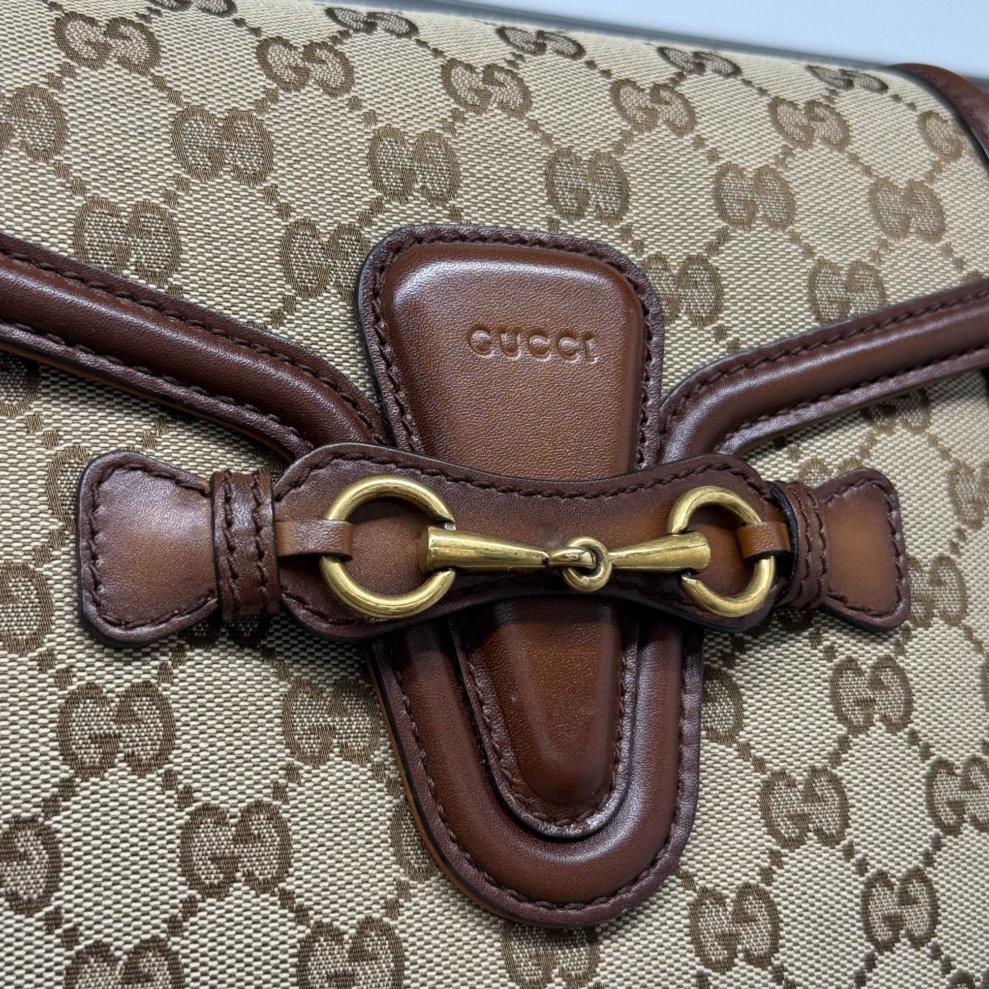 Le sac à bandoulière Lady Web en toile avec une bordure en cuir, un rabat avant avec fermeture rabattable, une bandoulière réglable, et une poche intérieure à bouton-pression et à fermeture éclair. Prix boutique 3600€
