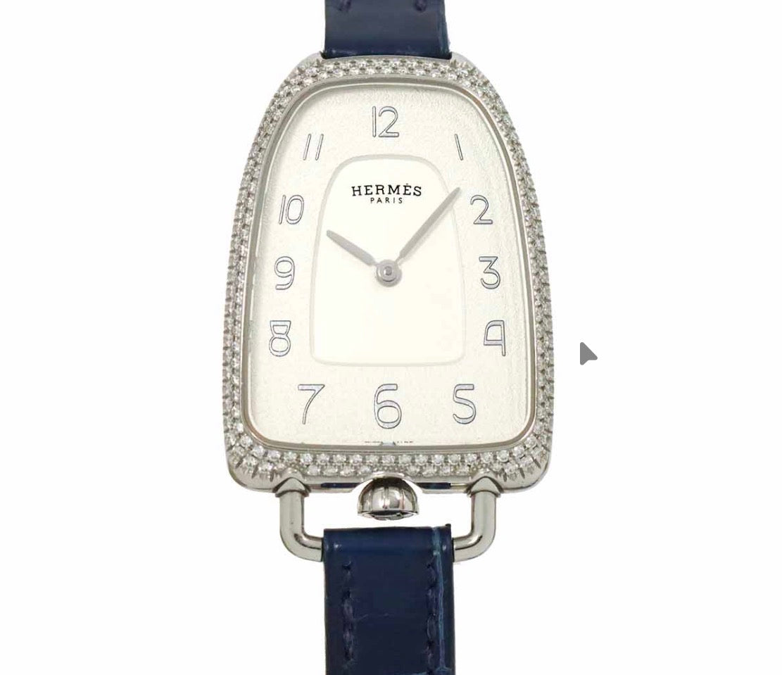 Hermès Galop d’Hermès GA1.230 – élégante montre femme en acier inoxydable, boîtier serti de 150 diamants (~0,45 ct), cadran argenté protégé par verre saphir. Mouvement quartz précis. Bracelet en cuir alligator navy avec boucle ardillon Hermès. Un modèle raffiné inspiré de l’étrier, alliant design unique et luxe intemporel.