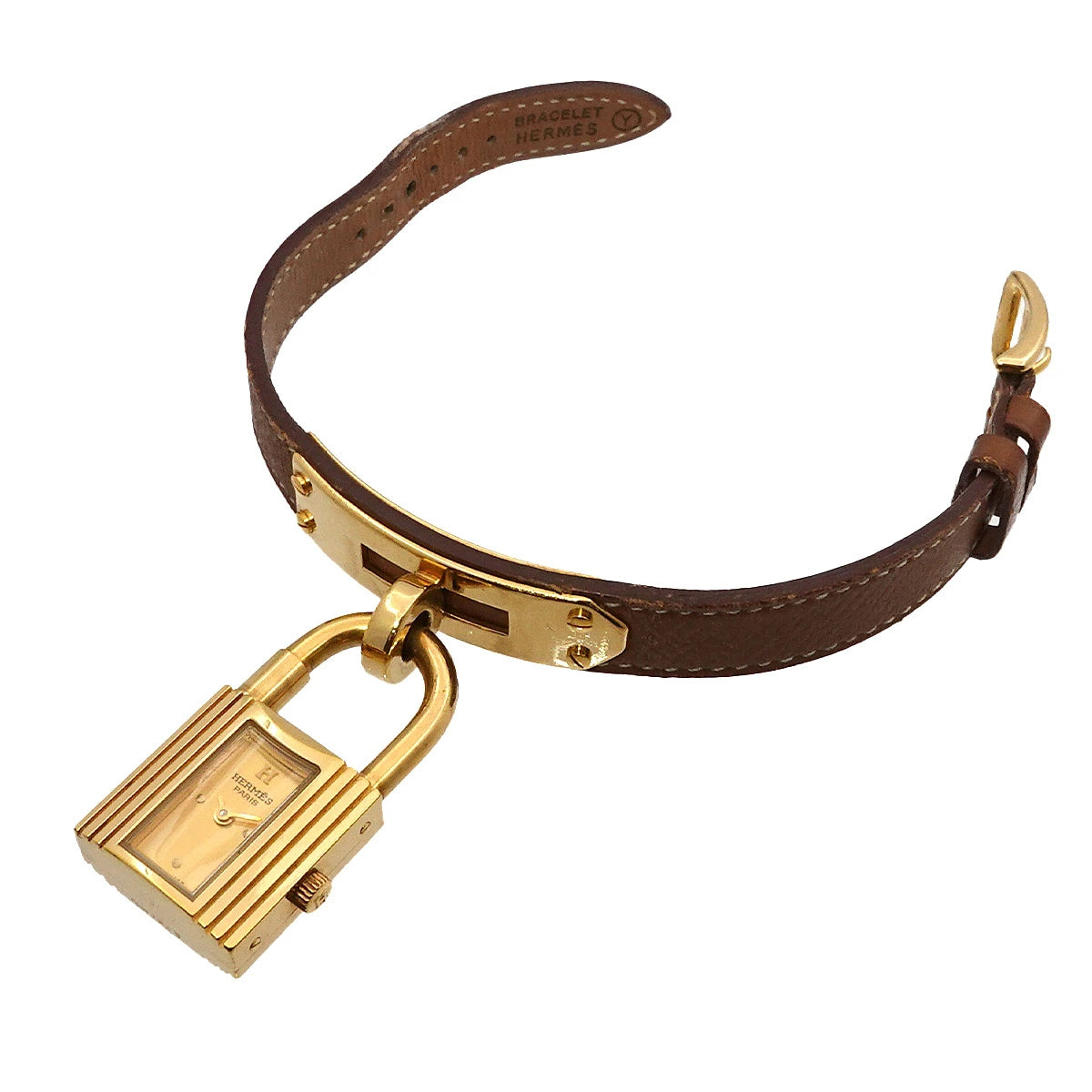 Montre Kelly , cadenas plaqué or 0,1 micron , bracelet en cuir Epsom , année 1994, bracelet de 14 à 17 cm , avec boîte