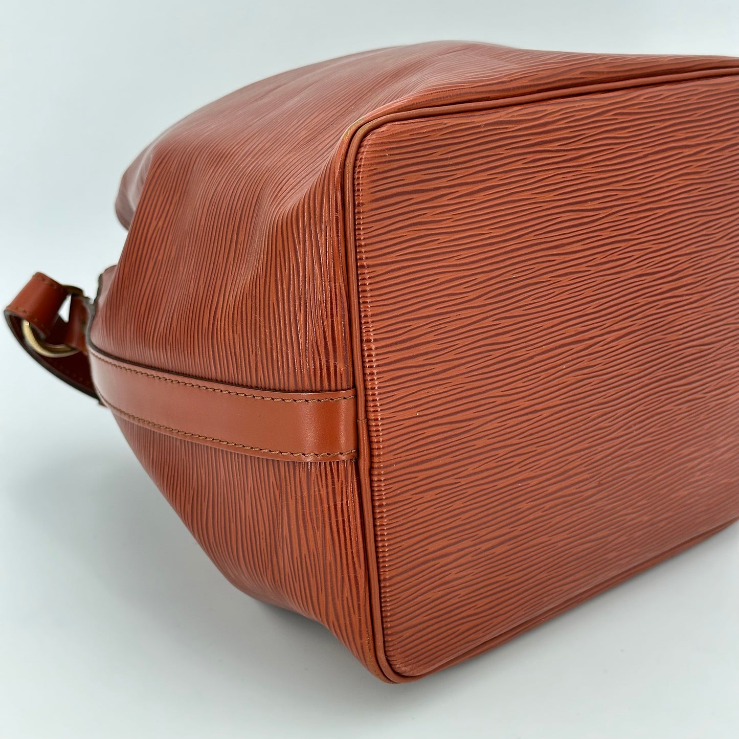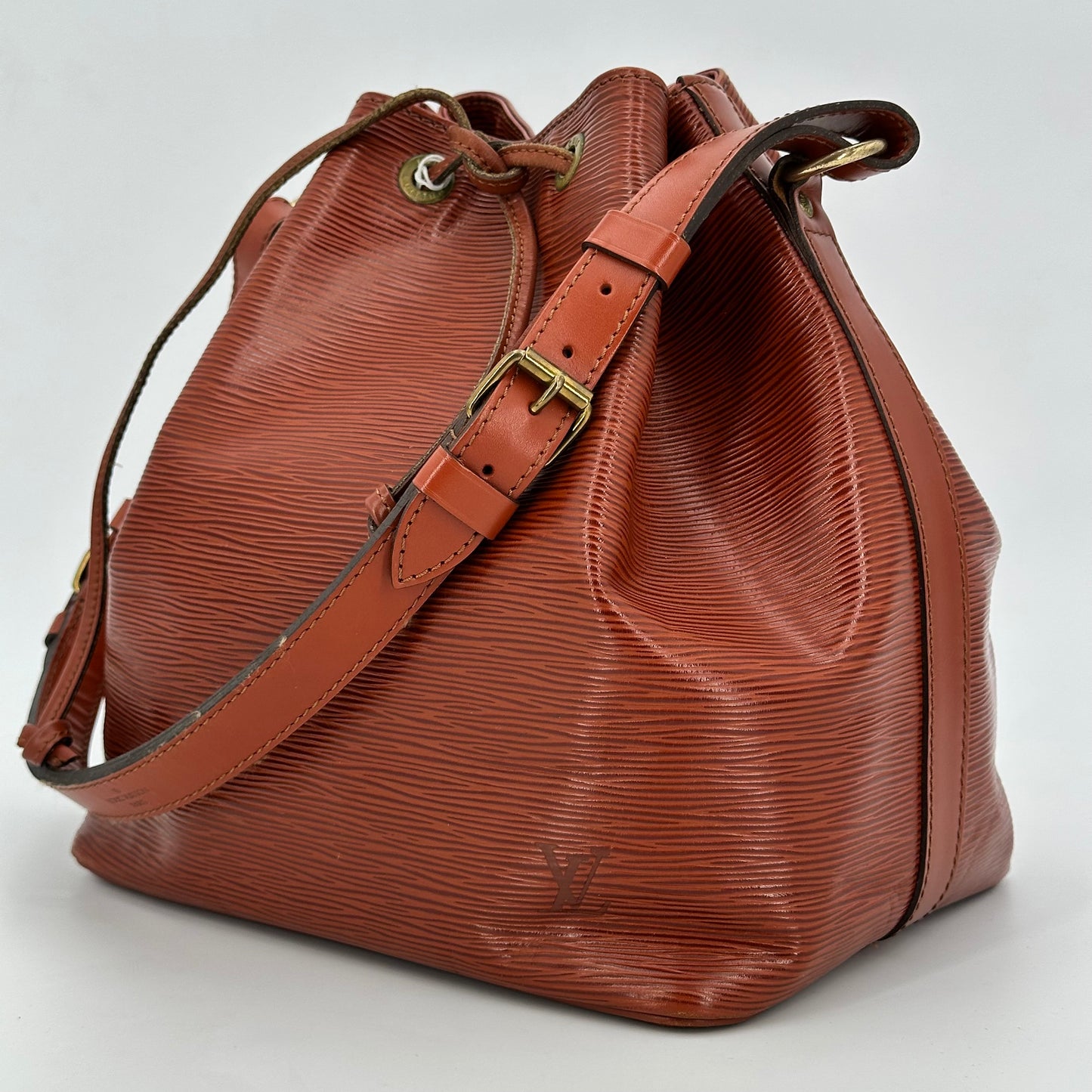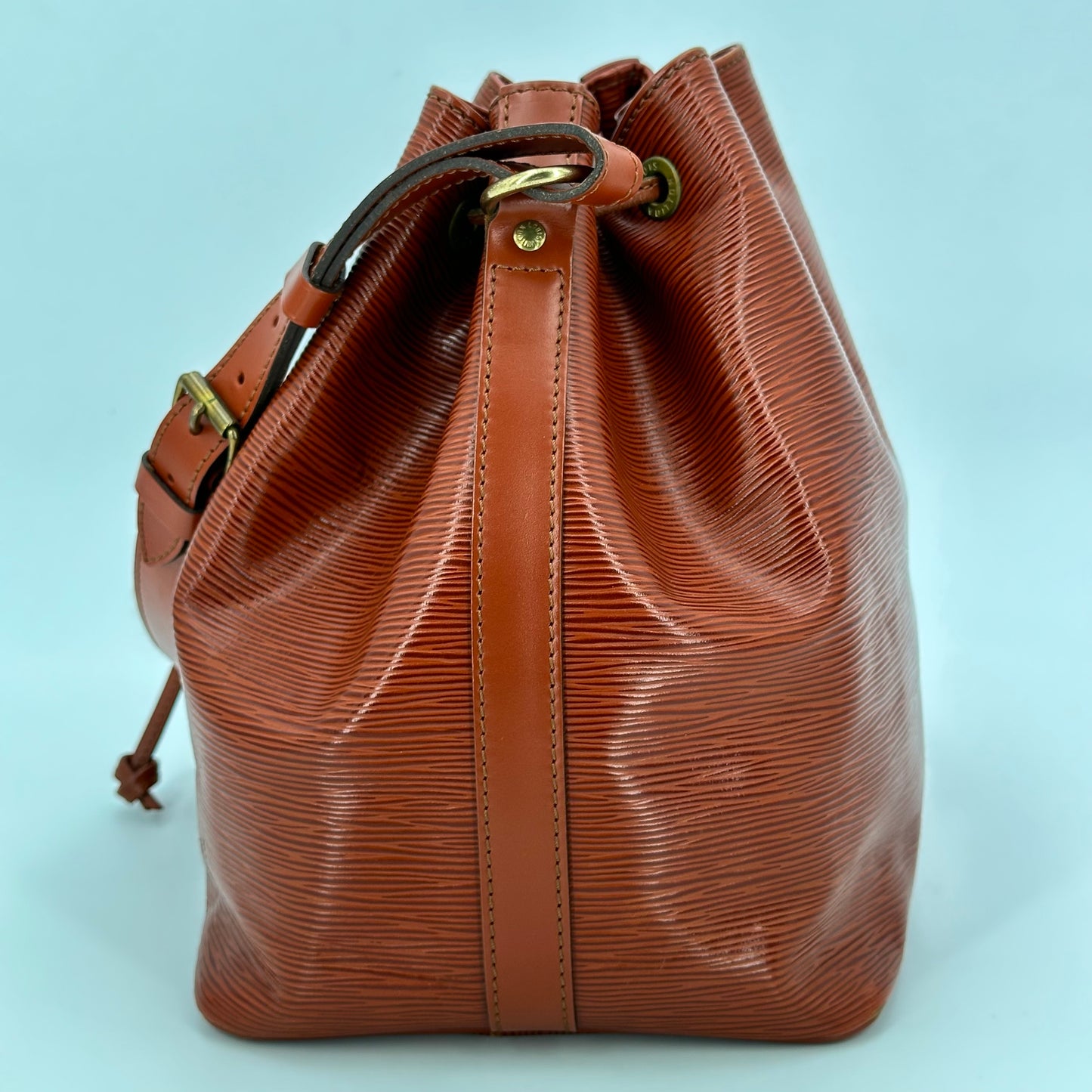 Sac Noé Louis Vuitton PM en cuir cognac, et intérieur en daim. Il se porte à l’épaule.