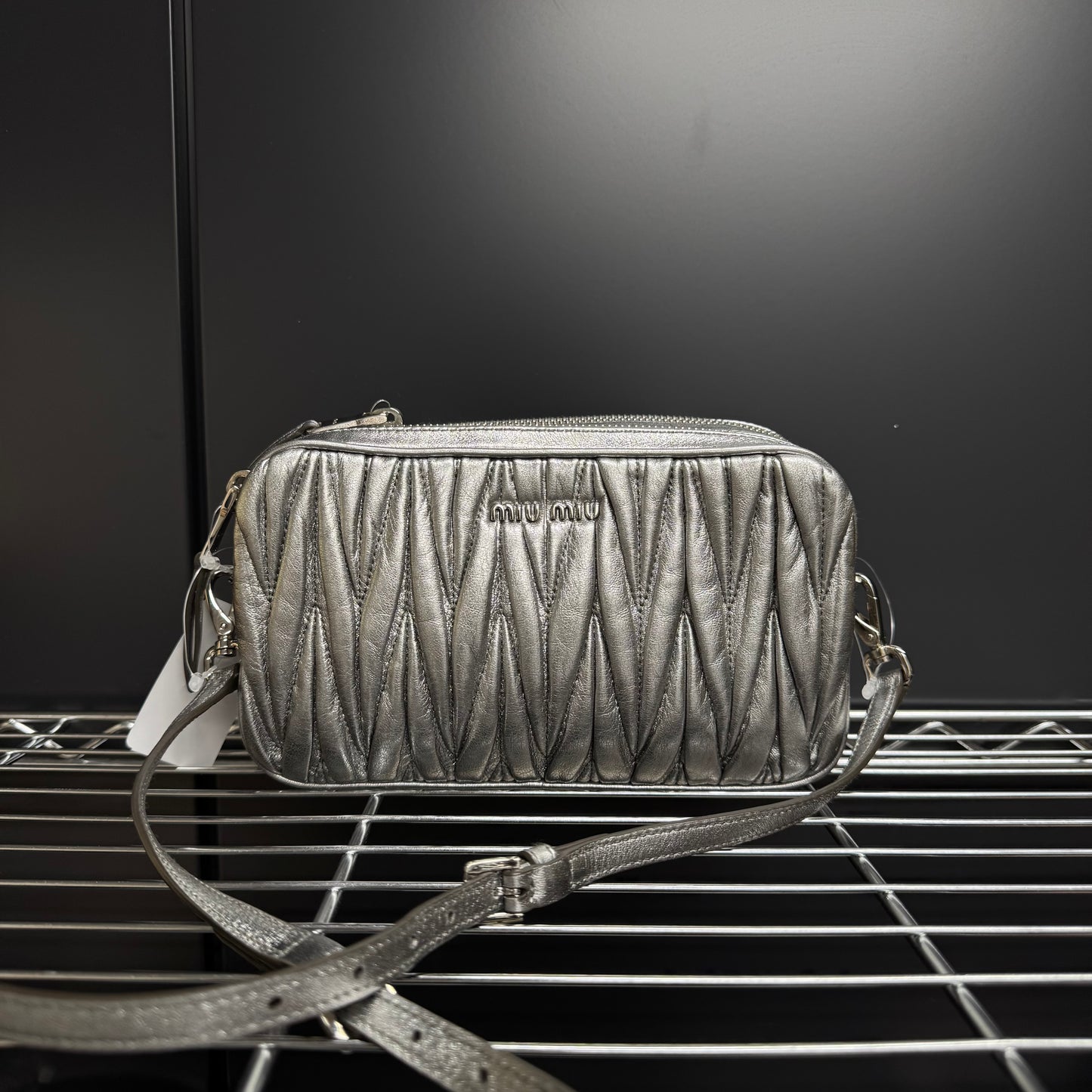 Sac Caméra miumiu en cuir de veau plissé argenté, porté crossbody .