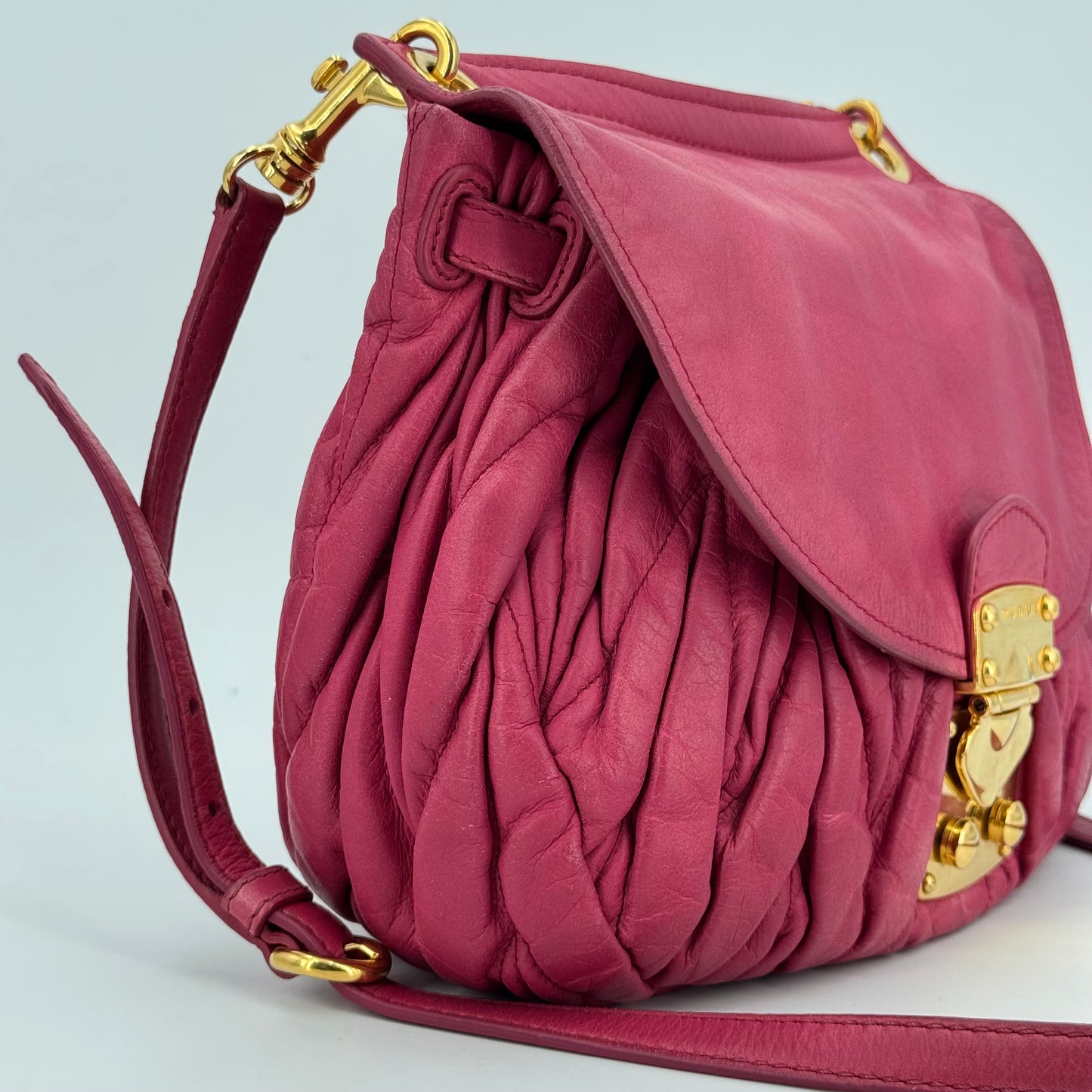 Sac coffre en cuir de veau vieilli fushia et bijouterie dorée , porté bandoulière.