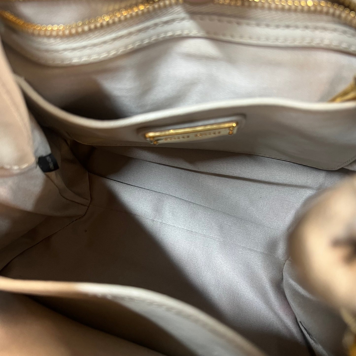 Sac MiuMiu en cuir beige et satin. Il se porte à la main ou crossbody.