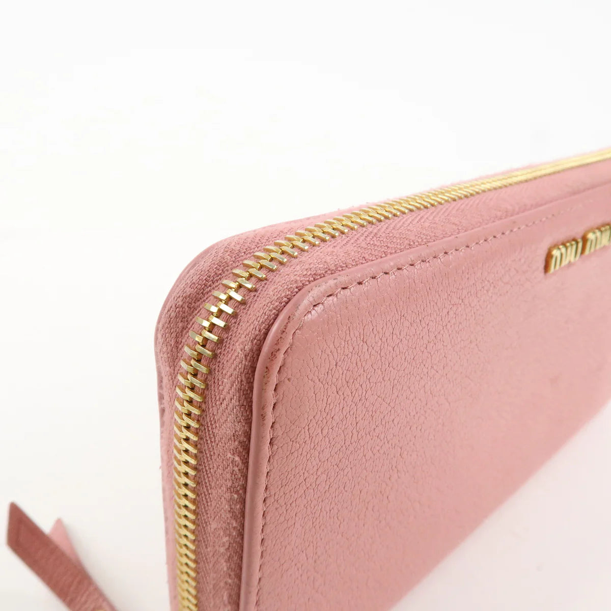 Portefeuille long zippé en cuir de veau grainé rose, bijouterie dorée