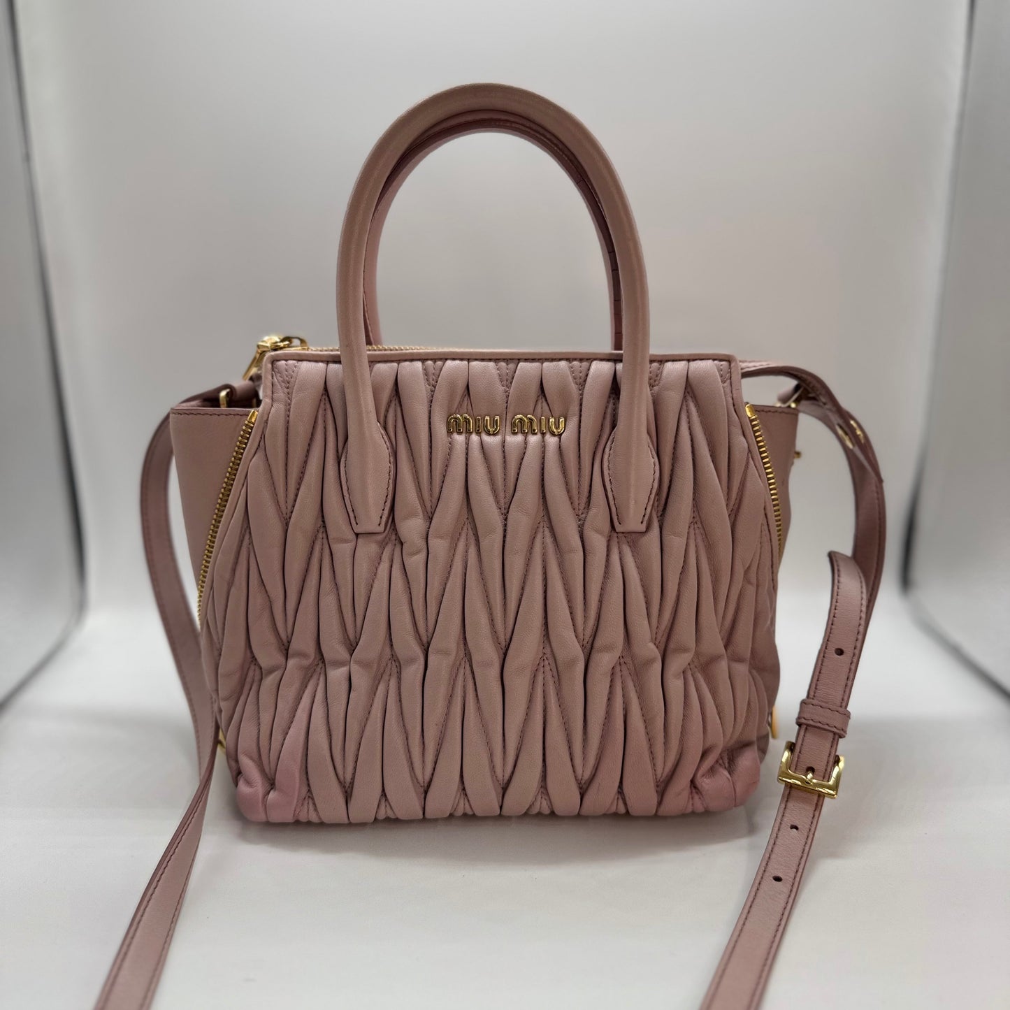 Sac tote Miu Miu en cuir de veau matelassé rose poudré, et bijouterie dorée. Il se porte à la main, ou crossbody.