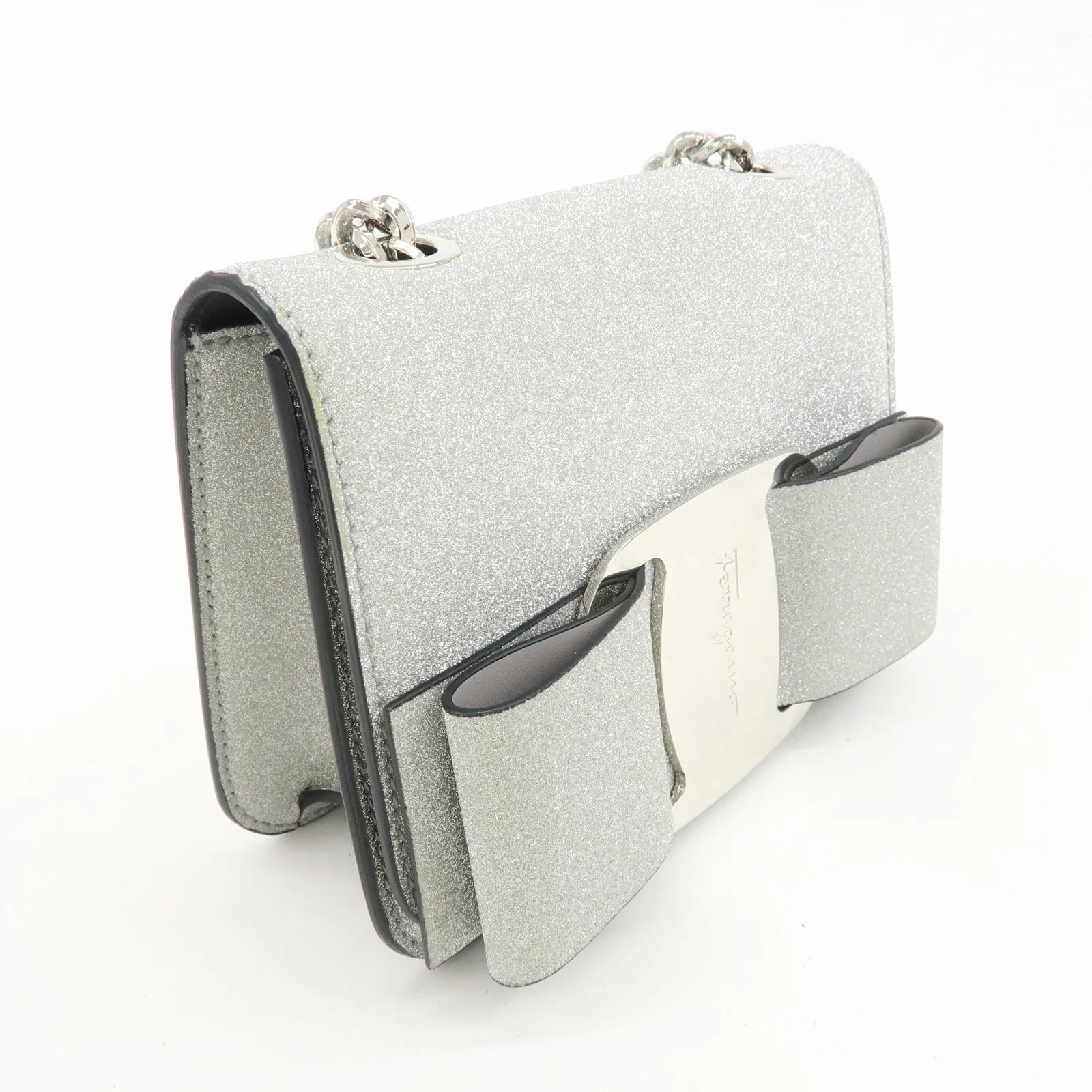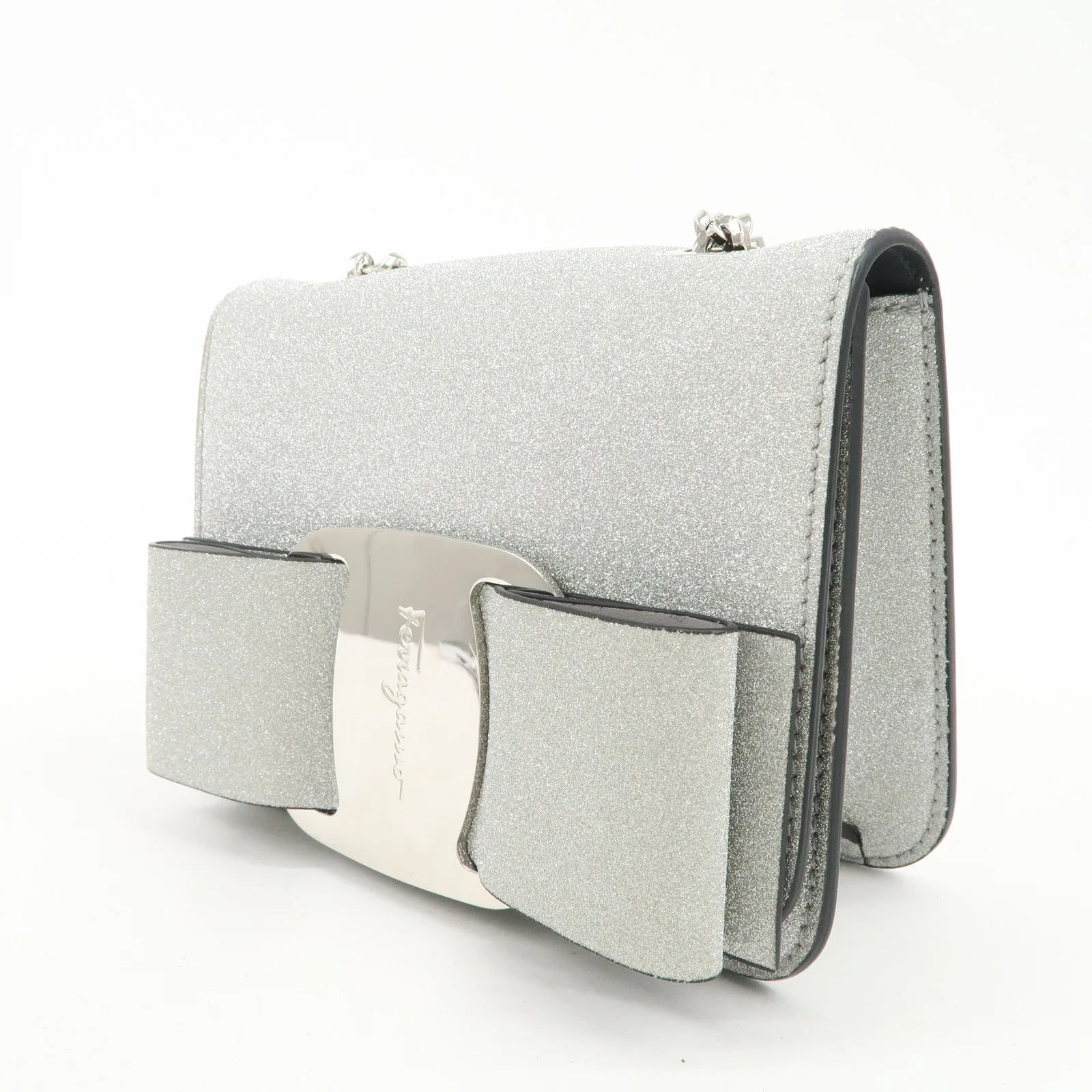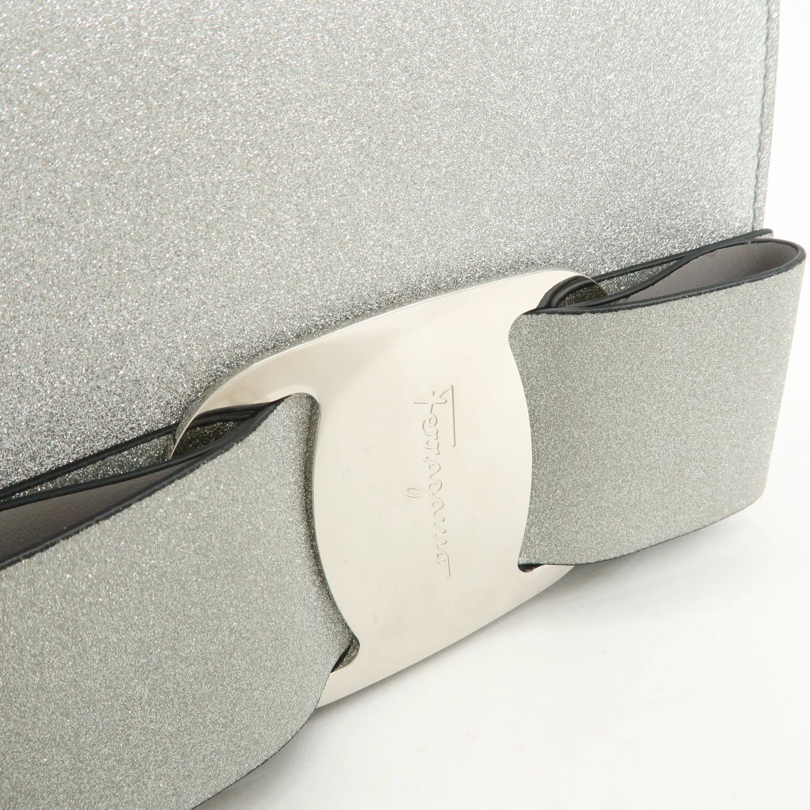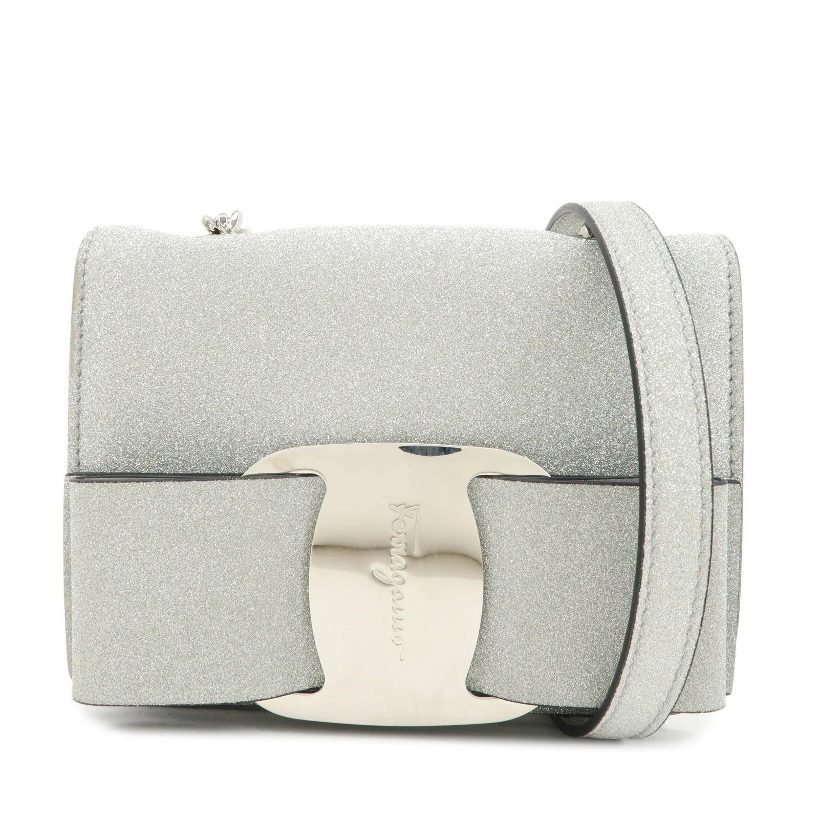 Mini sac Ferragamo avec son noeud vara en cuir argenté avec paillettes.