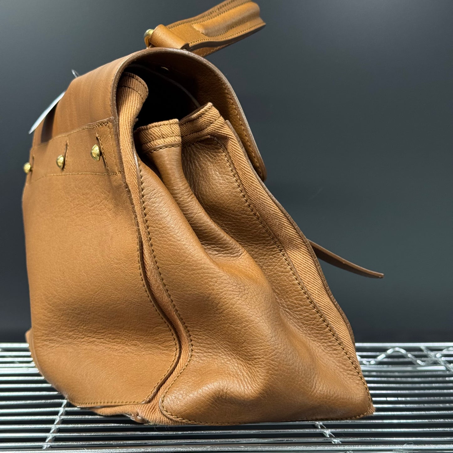 Sac Yves-Saint-Laurent en cuir de veau grainé couleur camel, et bijouterie dorée. Il se porte a la main.